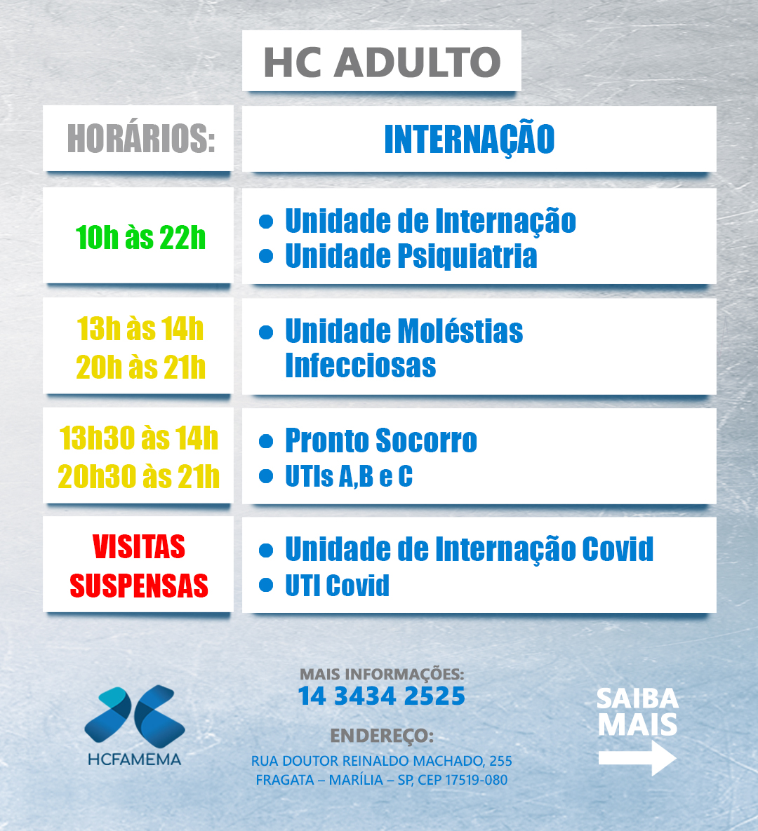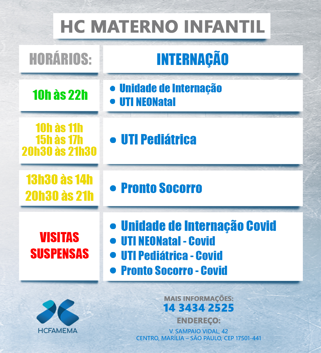 O Hospital das Clínicas da Faculdade de Medicina de Marília (HCFAMEMA) voltou a estender a partir da próxima segunda-feira (06/02) o horário de visitação de pacientes internados no HC Adulto (HC I) e HC Materno Infantil (HC II).