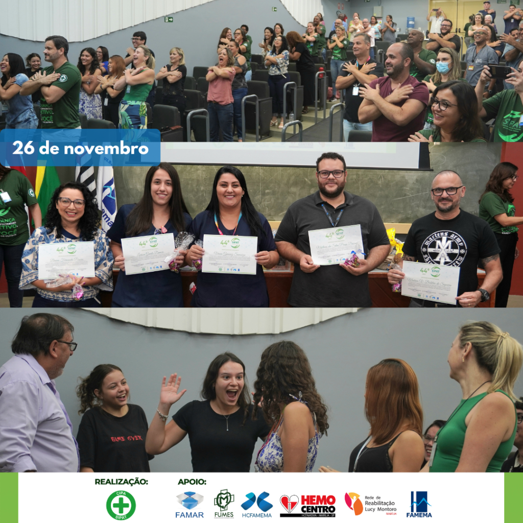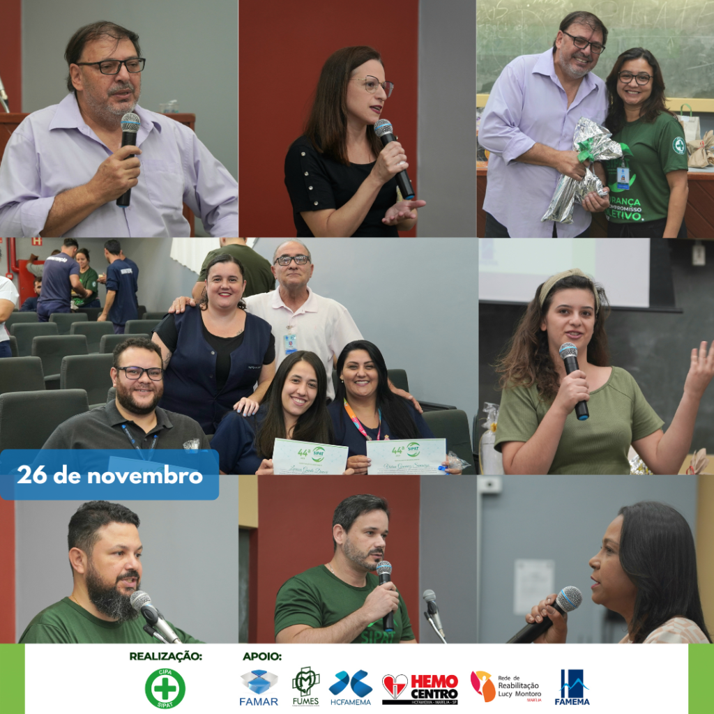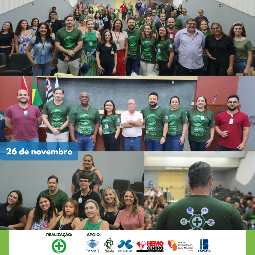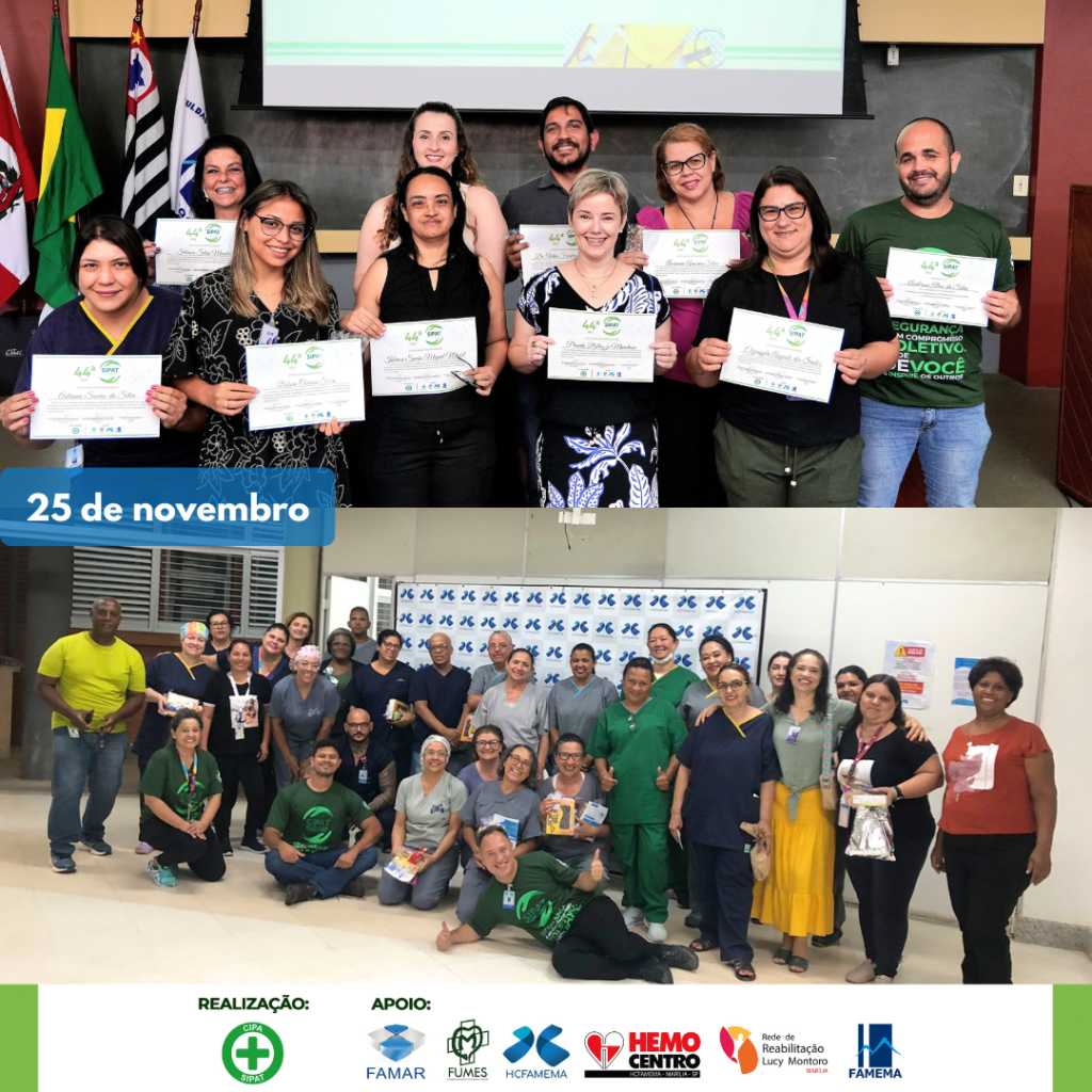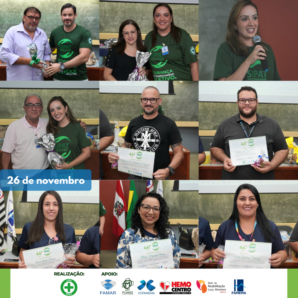 A 44ª Semana Interna de Prevenção de Acidentes de Trabalho teve início nos dias 25 e 26 de novembro de 2024 para todos os colaboradores do HCFAMEMA, FAMEMA, FAMAR e FUMES. Com o tema “Segurança é um compromisso coletivo, cuide de você e inspire os outros!”, as Comissões Internas de Prevenção de Acidentes e Assédio (CIPAS) organizam o evento que vai até o dia 29 de novembro.