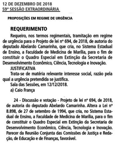A Assembleia Legislativa do Estado de São Paulo aprovou em sessão extraordinária nesta quarta-feira, dia 12 de dezembro, o Projeto de lei nº 694/2018, de autoria do deputado Abelardo Camarinha, que cria no Sistema Estadual de Ensino para constituir o quadro especial em extinção da Faculdade de Medicina de Marília na SDECTI – Secretaria de Estado do Desenvolvimento Econômico, Ciência, Tecnologia e Inovação.