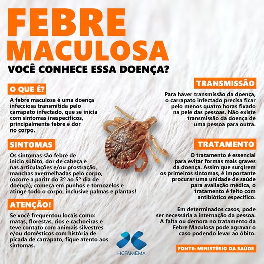 Febre Maculosa, você conhece essa doença? A febre maculosa brasileira, também conhecida como febre do carrapato, é transmitida pelo carrapato estrela, é uma infecção causada pela bactéria Rickettsia rickettsii após a picada de um carrapato. A febre maculosa tem cura,…