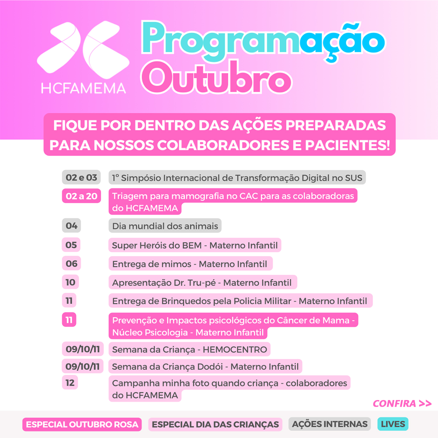🌸 Confira nossa Programação de Outubro! 🌸 Fique por dentro das ações preparadas para nossos colaboradores e pacientes. #hcfamema #outrubrorosa #sus