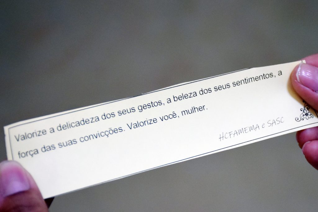 “A proposta é distribuir frases de apoio e reflexão que elevem a autoestima e ajude a levantar o moral feminino, uma forma que encontramos para valorizar e apoiar as mulheres do Hospital das Clínicas”, disse Valkíria Gomes Lima da Rocha, diretora técnica do SASC.