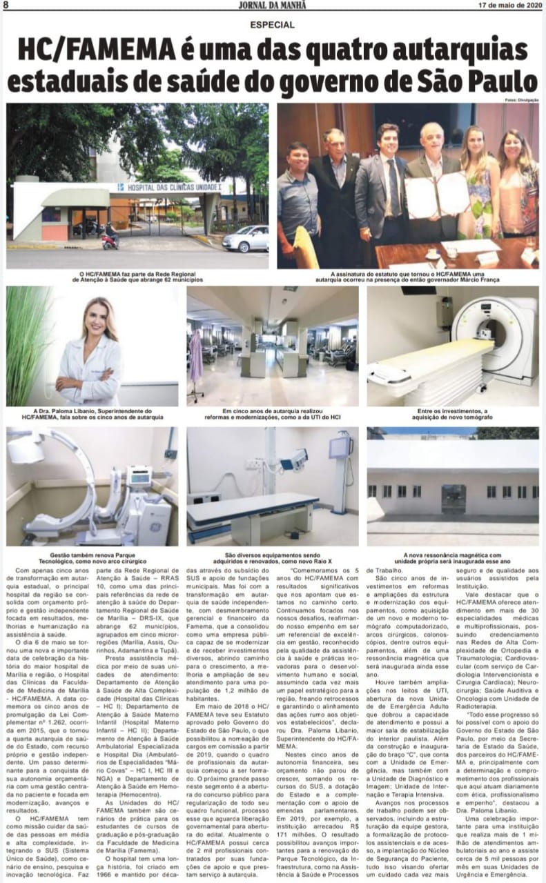 O Jornal da Manhã de Marília publicou no domingo, dia 17 de maio, uma reportagem especial sobre o aniversário de cinco anos da autarquia estadual de saúde Hospital das Clínicas da Faculdade de Medicina de Marília – HCFAMEMA. No dia 6 de maio de 2015 foi promulgado a Lei Complementar nº 1.262, aprovando e entrando em vigor o Estatuto do HCFAMEMA que a torna uma autarquia vinculada à Secretaria Estadual de Saúde do Governo de São Paulo. Leia a reportagem completa do Jornal da Manhã abaixo: