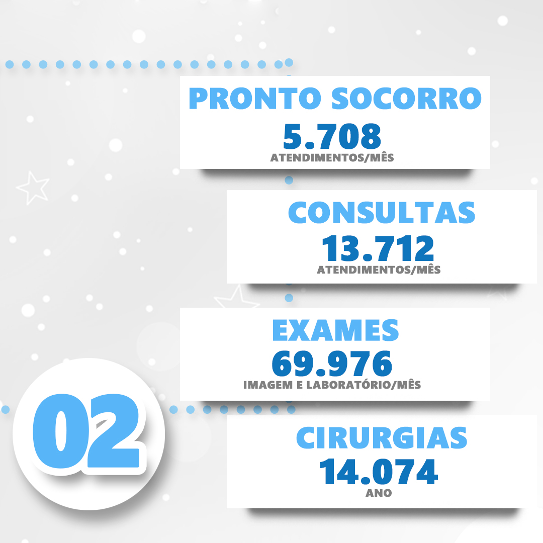 Conforme levantamento da Gerência de Gestão Planejamento e Avaliação do HCFAMEMA, em 2022, por mês, 5.708 atendimentos no Pronto Socorro, 13.712 consultas e 14.074 cirurgias. Exames de imagem e laboratoriais atingiram a média de 69.976/mês em 2022.