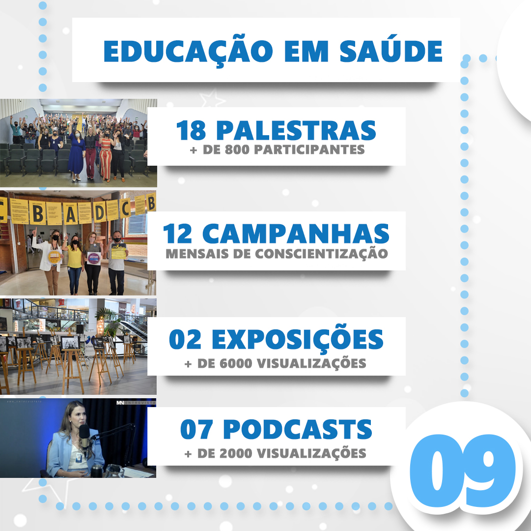 O ano de 2022 foi muito importante para as ações de Educação em Saúde. Além das 12 campanhas mensais de cores com engajamento dos colaboradores, a instituição também promoveu ações que se estenderam por toda comunidade, como a Exposição “Olhares da Linha de Frente” (mostra fotográfica que trouxe o dia-a-dia da equipe da assistência nos piores momentos da pandemia) e “Mulheres que Inspiram” (campanha em que mulheres e pacientes do hospital chamam a atenção para o exame da mamografia). A mensagem de Educação em Saúde também chegou aos clubes de serviço, empresas e instituições não governamentais no total de 18 palestras e 800 participantes. Também houve representação em sete PodCasts, que somam mais de 2 mil visualizações.