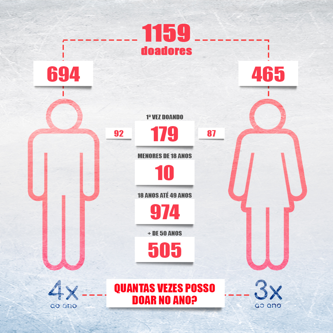 Conforme levantamento do Hemocentro HCFAMEMA, no mês de janeiro de 2023 doaram sangue 694 homens e 465 mulheres. Ainda conforme relatório, 179 pessoas doaram sangue pela primeira vez, sendo 10 deles com idade entre 16 e 18 anos.