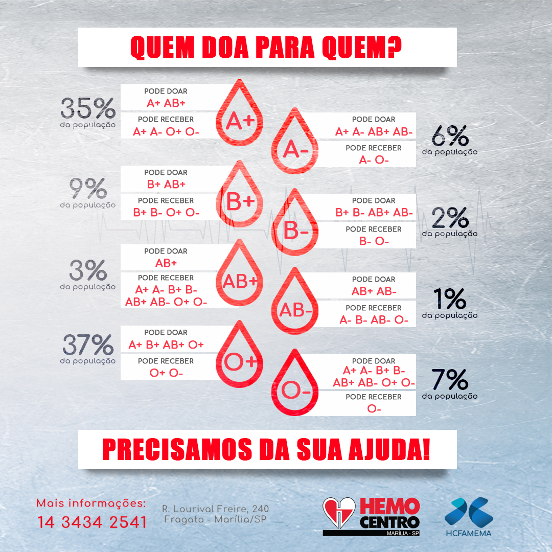 Você sabe o seu tipo sanguíneo? Em caso de necessidade, cada tipo tem uma compatibilidade específica para doar ou receber uma transfusão. Confira os tipos sanguíneos, qual o percentual presente na população, para quem pode doar ou receber sangue.