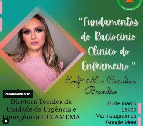 A enfermeira mestre Caroline Brandão, diretora técnica da Unidade de Urgência e Emergência do Hospital das Clínicas da Faculdade de Medicina de Marília – HCFAMEMA, realizará nesta quarta-feira, dia 18 de março, às 20h, uma aula ao vivo online transmitida pelo Instagram, com o tema “Fundamentos do Raciocínio Clínico do Enfermeiro”.