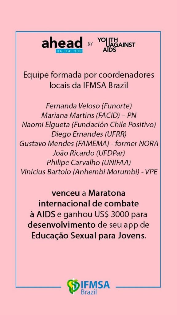 O estudante de Medicina da FAMEMA, Gustavo Mendes e Silva, integrou a equipe da IFMSA Brazil que participou e venceu a Maratona Internacional de Combate à AIDS da organização não governamental alemã Youth Against AIDS – YAA (Jovens Contra AIDS). A Ahead Hackathon (Maratona de Programação Ahead), realizada de 3 a 5 de julho, premiou com US$ 3 mil o projeto de criação de um aplicativo de celular sobre educação sexual para jovens.