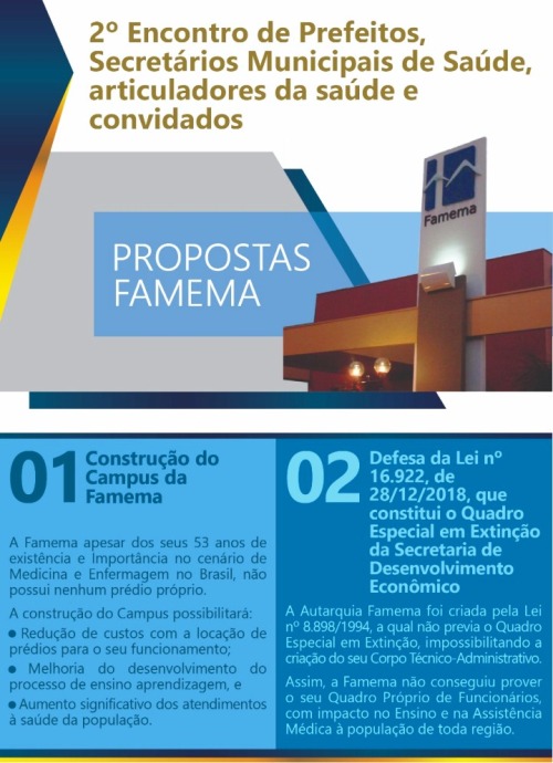A diretoria da Famema (Faculdade de Medicina de Marília) e a Superintendência do HCFAMEMA promoveram na manhã desta quarta-feira, dia 17 de abril, no Auditório Dr. Mário Alberto Cosentino, o 2º Encontro de Prefeitos, Secretários de Saúde e articuladores de saúde dos municípios integrantes do DRS IX – Departamento Regional de Saúde. O objetivo do evento foi fortalecer a parceria da Famema e do HCFAMEMA com os municípios.