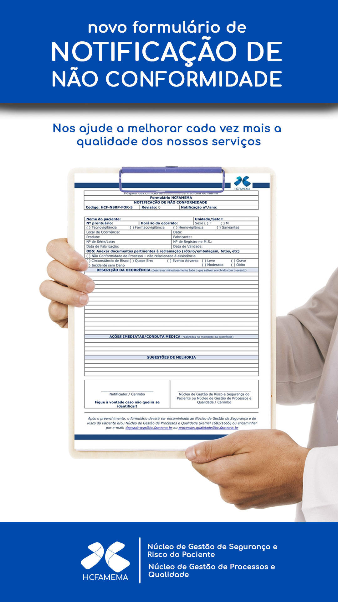 O novo formulário de NOTIFICAÇÃO DE NÃO CONFORMIDADE, substituirá os formulários de erros de medicação, queda do paciente e desvio de qualidade de materiais. Além do mais, outras falhas também devem ser notificadas, de acordo com a ANVISA, tanto falhas na assistência como nos processos administrativos.