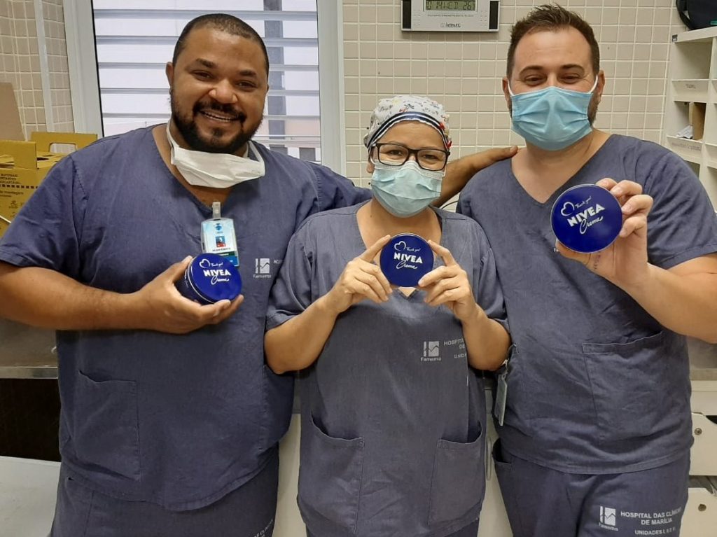 A Gerência de Engenharia de Segurança e Medicina do Trabalho (GESMT) do Hospital das Clínicas da Faculdade de Medicina de Marília (HCFAMEMA), em parceria com o Departamento de Infraestrutura e Logística (DIL), estão distribuindo para os funcionários o Creme Hidratante Nivea, conhecido por sua tradicional embalagem em lata azul de 56g. O produto foi doado pela própria fabricante como forma de presentear médicos, enfermeiros e todos os profissionais que estão direta ou indiretamente se dedicando ao enfrentamento da pandemia da COVID-19.