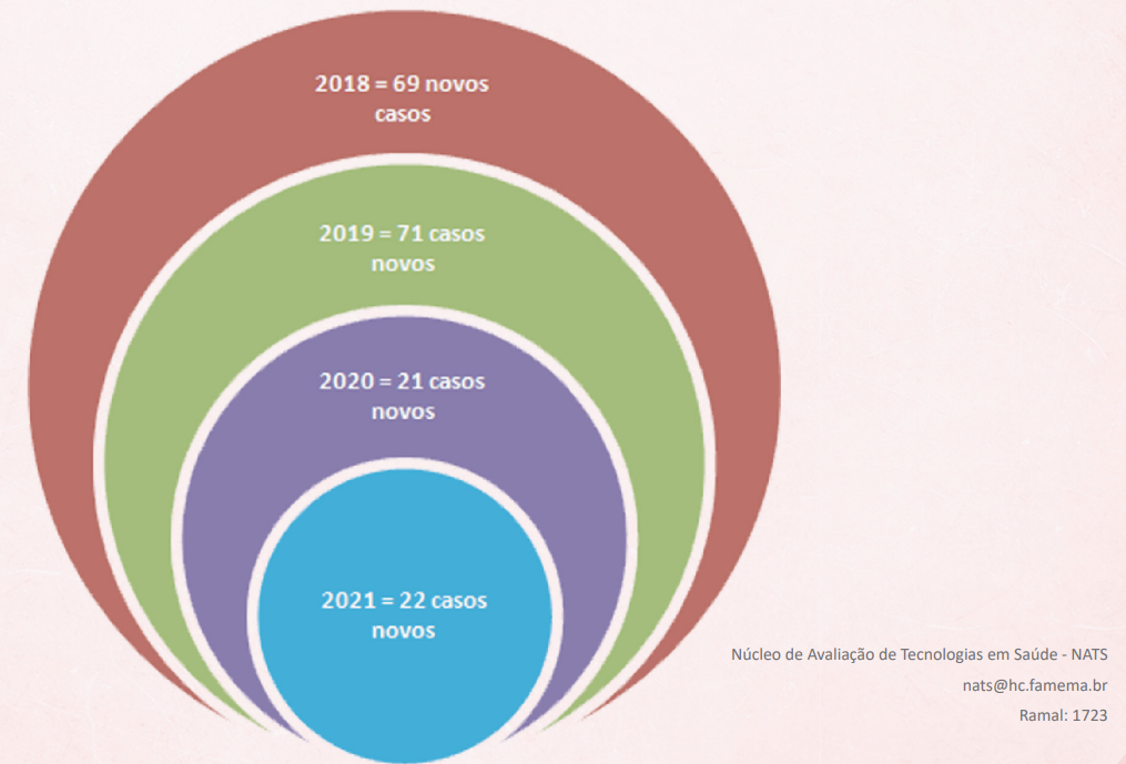 É muito importante ressaltar que a Constituição Federal, em seu artigo 196 estabelece que “a saúde é direito de todos e dever do Estado, garantido mediante políticas sociais e econômicas que visem à redução do risco de doença e de outros agravos e ao acesso universal e igualitário às ações e serviços para sua promoção, proteção e recuperação”. Quando o paciente busca na justiça o seu direito de tratamento, seja ele medicamento, exame, dieta enteral e/ou internação, esse processo é denominado judicialização. É importante entender, também, que o governo (federal, estadual e municipal) destina verbas anuais para a área da Saúde e que essas verbas devem suprir e manter todas as ações de promoção, proteção e prevenção para TODOS os habitantes de sua esfera. Nos últimos anos constata-se no Brasil um aumento do número de decisões judiciais obrigando o poder público a fornecer medicamentos, insumos, equipamentos e cirurgias. Em 2021, o Conselho Nacional de Justiça (CNJ) publicou um estudo chamado “Judicialização e Sociedade – Ações para acesso à saúde pública de qualidade”, onde foi verificado junto aos Tribunais de Justiça de todo o Brasil, de 2015 (322.395 ações) a 2020 (486.423 ações), evidenciando um aumento de 50,88% de novos casos. A região Sudeste é a que contabiliza o maior número de casos novos nesse período (2015-2020), somando 935.035 novos casos dentro de um total de 2.250.733 casos registrados. Pelo estudo da CNJ, com o retorno das atividades normais dos serviços à saúde e a falta de ingredientes farmacêuticos ativos (IFA) no mercado global, há uma tendência ao aumento dos casos judicializados. Com o objetivo de monitorar essa tendência, o Núcleo de Avaliação de Tecnologias em Saúde tem realizado o mapeamento dos novos casos da judicialização de prescrições geradas em todo o HCFAMEMA. Em 2022, até o mês de setembro, foram registrados 26 casos novos. Os itens mais judicializados são as insulinas de ação rápida (lispro e asparte) e de ação prolongada (glargina, detemir, levemir e degludeca), bem como, seus acessórios: agulha para caneta aplicadora, fita reagente de glicose, lanceta para coleta de sangue capilar, além dos acessórios de bomba de insulina (não disponibilizados pelo SUS). JUDICIALIZAÇÃO EM SAÚDE zados pelo SUS).