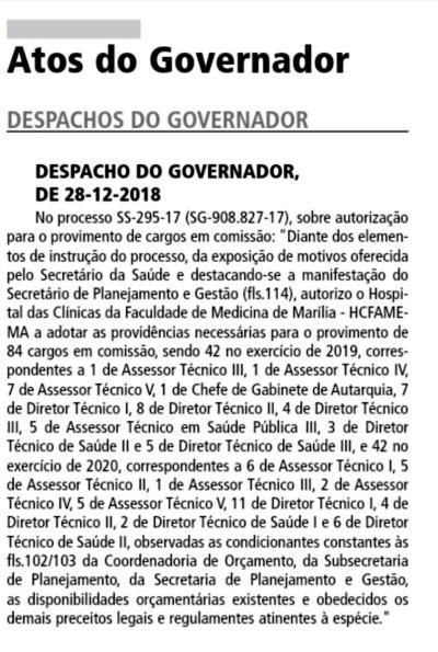 Publicação no Diário Oficial do Estado, neste sábado, dia 29 de dezembro, despacho do Governador Márcio França, autoriza o HCFAMEMA a adotar as providências necessárias para o provimento de cargos em comissão. Ao todo são 84 cargos em comissão, sendo 42 no exercício de 2019 e outros 42 no exercício de 2020.