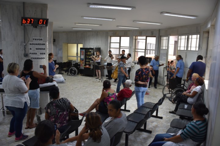 O quinteto de instrumentistas de uma orquestra sacra de Marília se apresentou na tarde de sábado, dia 8 de fevereiro, no saguão do Pronto Socorro do Hospital das Clínicas da Faculdade de Medicina de Marília – HCFAMEMA. Eles reproduziram diversas músicas clássicas durante o período de uma hora, tendo como plateia os pacientes e familiares que aguardavam o atendimento, como também funcionários da instituição que passavam pelo local.
