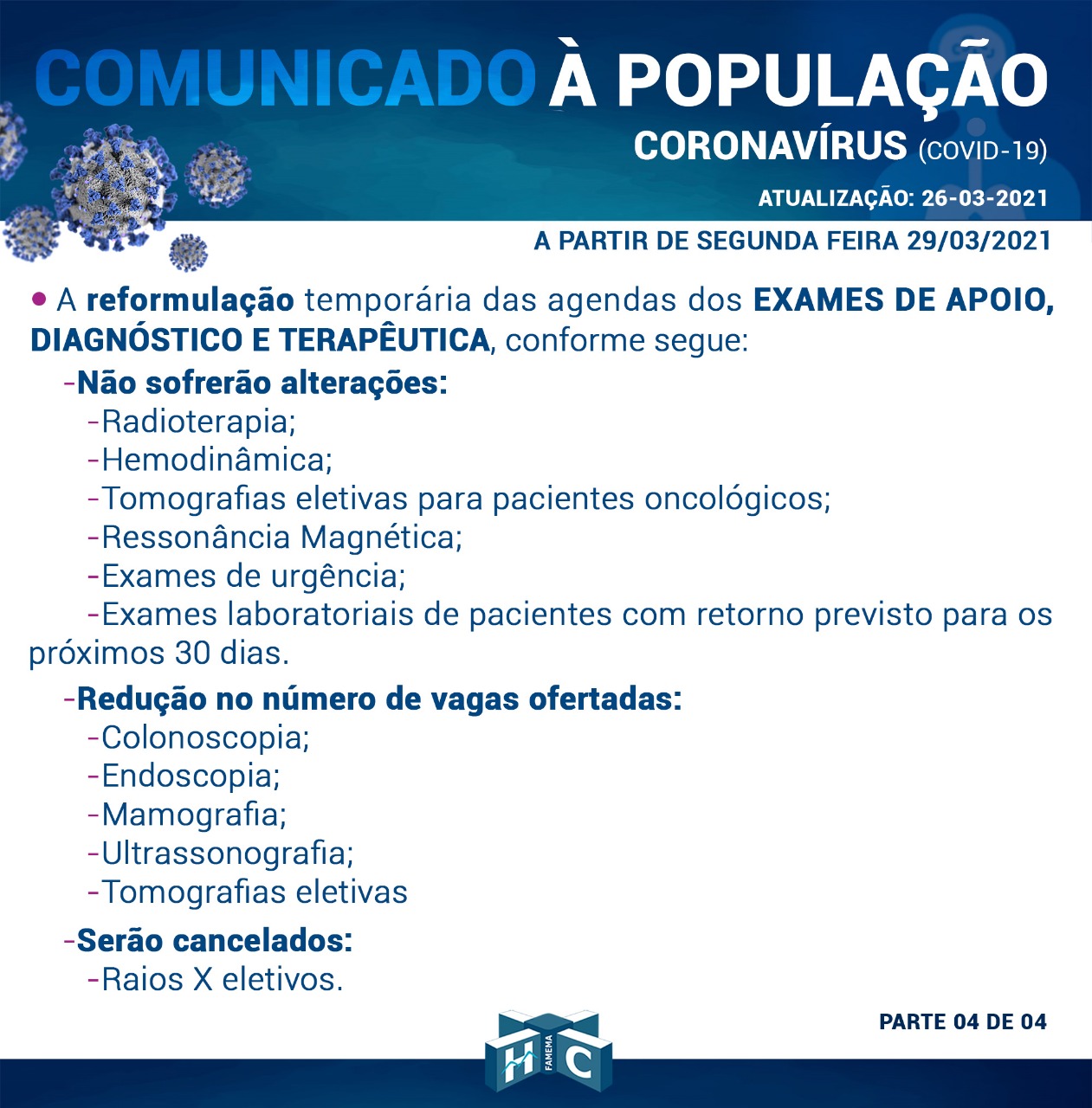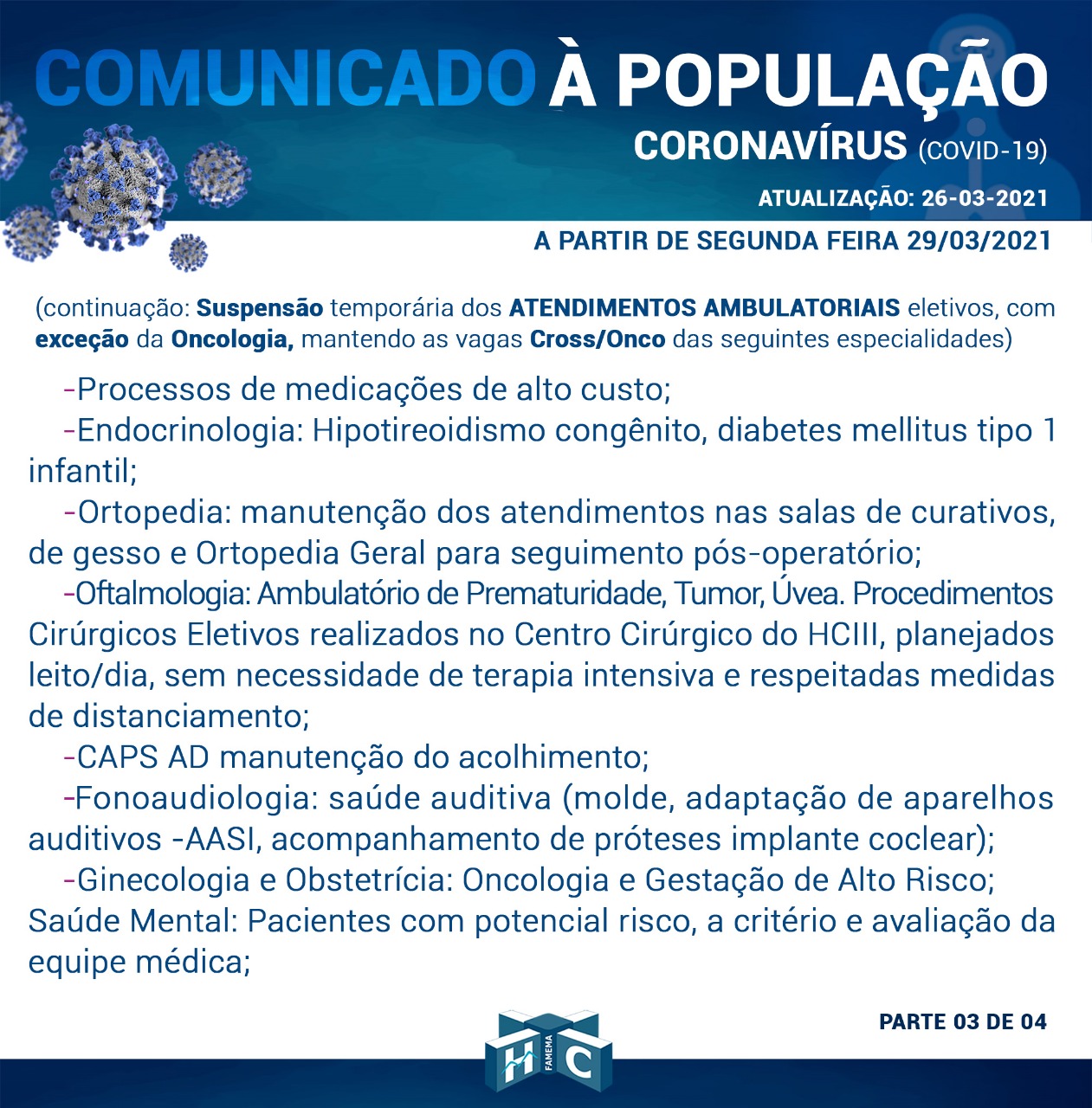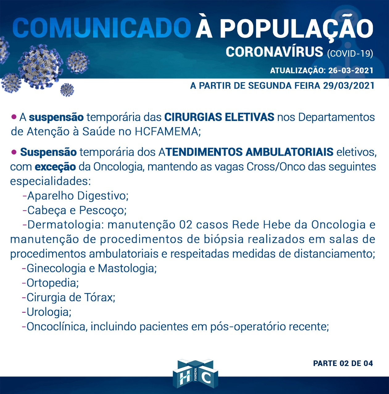 Com isso, todas as cirurgias eletivas ficam suspensas temporariamente, bem como os atendimentos ambulatoriais eletivos, com exceção da Oncologia. Serão mantidos atendimentos encaminhados pela CROSS/Onco de algumas especialidades.