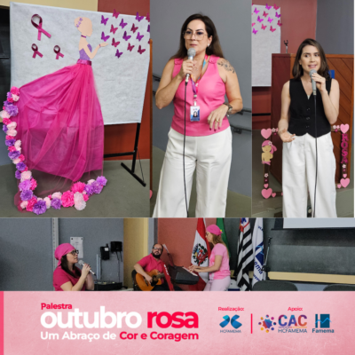 Ao longo da tarde, os participantes puderam vivenciar palestrar que ajudaram a entender melhor sobre o câncer de mama. A médica ginecologista, doutora Amisbele Angelucci, do HCFAMEMA, trouxe a importância do autocuidado e da prevenção; a enfermeira Ana Claudia Gomes Soares, também do hospital, explicou a linha de cuidado do paciente em tratamento quimioterápico na instituição; e Sheilla Luz, mestre em engenharia urbana, que trouxe o tema “Imunidade emocional: como manter a sua”.