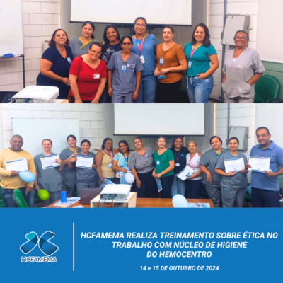 O Núcleo de Ingresso do Departamento de Gestão de Pessoas do HCFAMEMA realizou, nos dias 14 e 15 de outubro de 2024, treinamento com os colaboradores do Núcleo de Higiene do Hemocentro sobre Ética no trabalho, uma ação do PROVALORIZE do NÚCLEO DE INGRESSO-DGP.