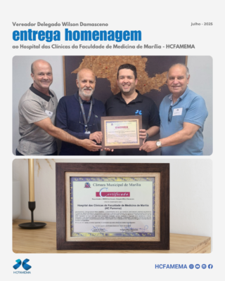Nesta sexta-feira, 18 de julho de 2025, recebemos na Superintendência do Hospital das Clínicas da Faculdade de Medicina de Marília o Vereador Delegado Wilson Damasceno, que pessoalmente entregou ao Dr. Tarcísio Adilson Ribeiro Machado (Superintendente) e ao Dr Igor Ribeiro de Castro Bienert (Chefe de Gabinete), o certificado de votos de congratulações e reconhecimento ao HCFAMEMA pelos 10 anos de autarquia estadual vinculada à Secretaria de Estado da Saúde de São Paulo, celebrado em 06 de maio de 2025.