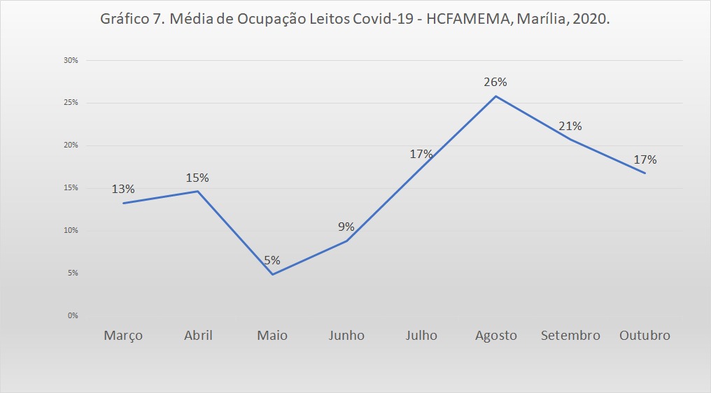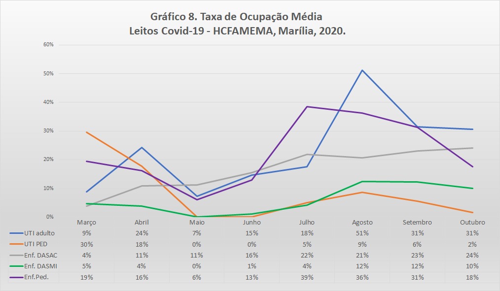 A taxa média de ocupação geral de leitos Covid HCFAMEMA, entre março a outubro variou de 5% a 26% dos leitos. Enfermaria adulto DASAC a variação foi de 4% a 24% dos leitos. Vejam os detalhes nos gráficos abaixo.