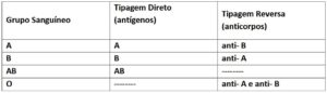 Na tabela a seguir poderemos observar a relação existente entre antígenos eritrocitários e anticorpos correspondentes nos respectivos grupos sanguíneos.