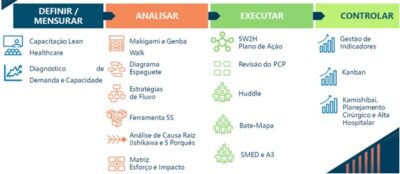 No Centro Cirúrgico essas ferramentas também foram aplicadas, assim como implementada a realização do Huddle e bate-mapa diariamente, juntamente com a gerência do Centro Cirúrgico, Enfermeiros, Anestesista, representantes da OPME e Enfermeiro do Núcleo Interno de Regulação. O SMED também foi implementado sendo identificados os tempos dos desperdícios de processos de trabalho.