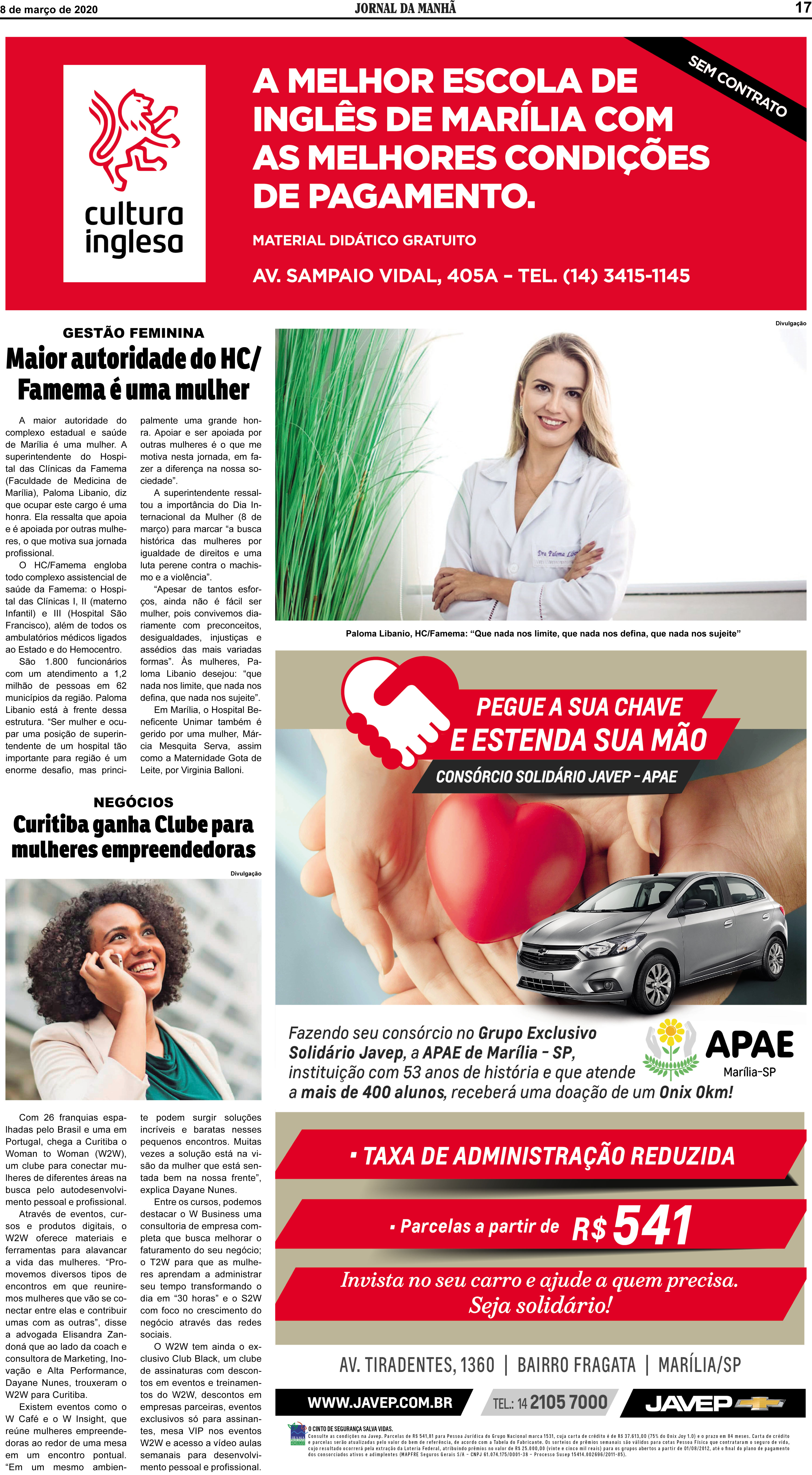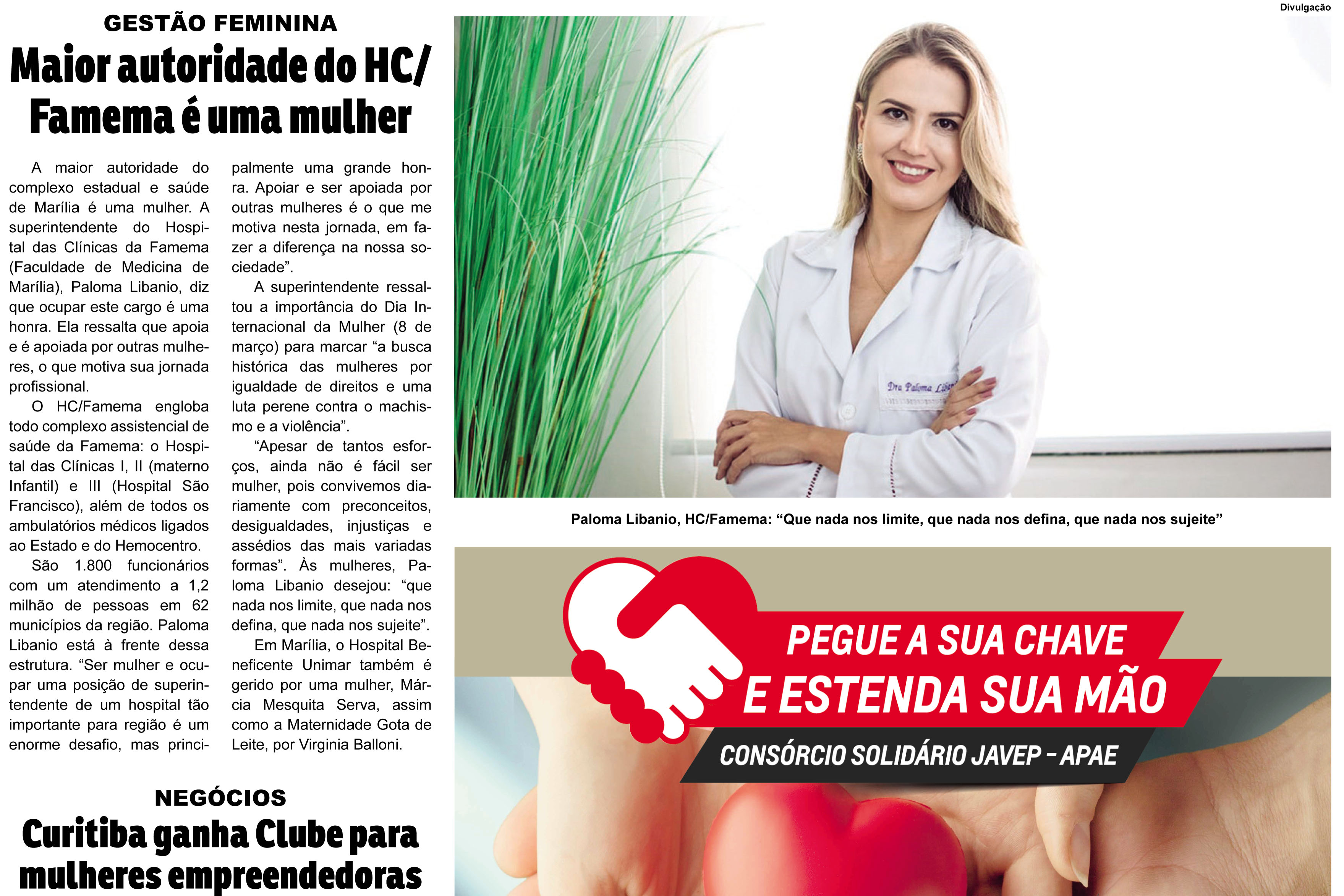 A edição especial do Jornal da Manhã de Marília do último domingo, dia 8 de março, no Dia Internacional da Mulher, publicou uma série de reportagens em comemoração à data e uma delas foi uma entrevista com Dra Paloma Libanio, superintendente do Hospital das Clínicas da Faculdade de Medicina de Marília – HCFAMEMA, sobre gestão feminina. Veja a reportagem em cópia na íntegra escrita pela repórter Ana Carolina Godoy: