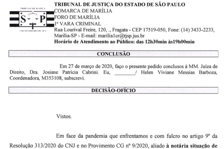 Na terça-feira, dia 24, o corregedor-geral da Justiça de São Paulo, desembargador Ricardo Mair Anafe, chegou a orientar que todos os recursos provenientes de prestação pecuniária fossem destinados para o combate da pandemia da covid-19. A medida também já estava prevista na Resolução nº 313 do Conselho Nacional de Justiça, desde o dia 19 de março.