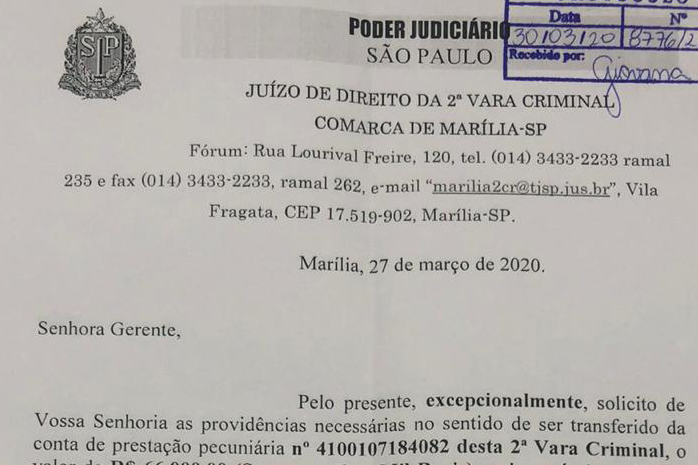 O Tribunal de Justiça do Estado de São Paulo, através das duas Varas Criminais de Marília, autorizou no dia 27 de março a transferência bancária de R$ 307.990,00 para o Hospital das Clínicas da Faculdade de Medicina de Marília – HCFAMEMA, sendo R$ 99.990 provenientes da 1ª Vara Criminal e R$ 208 mil da 2ª Vara Criminal.
