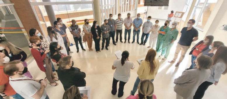 O HCFAMEMA faz parte do projeto “Lean nas Emergências”, uma iniciativa do Ministério da Saúde que trouxe para a instituição o acompanhamento de gestores do Hospital Beneficência Portuguesa, de São Paulo. As primeiras intervenções ocorreram com visitas presenciais, que levaram as equipes da assistência a refletirem e iniciarem implementações de soluções para o Pronto Socorro do Hospital das Clínicas Adulto. As ações em equipe geraram resultados extremamente satisfatórios, com a liberação dos corredores e sala de transição – locais que historicamente o paciente permanecia à espera por assistência. Dentre os novos processos, o Huddle (que na tradução para o português significa “um amontoado de pessoas”) passou a fazer parte da rotina das equipes. Realizada em dois momentos no dia em encontros de 10 minutos, LEAN NAS EMERGÊNCIAS possibilita o gerenciamento de qualidade e segurança de demandas que poderiam afetar o trabalho.