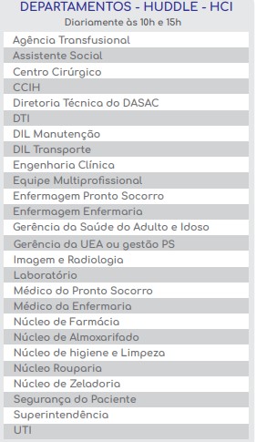 “O Huddle é um instrumento de gestão que veio para o HCFAMEMA pelo Projeto Lean nas Emergências. Nele é possível traçar o perfil do Pronto Socorro em dois momentos do dia, 10h e às 15h. Com representantes de múltiplos setores conseguimos identificar as ações que precisam ser tomadas imediatamente e outras em que elegemos prazos de resolução. ”