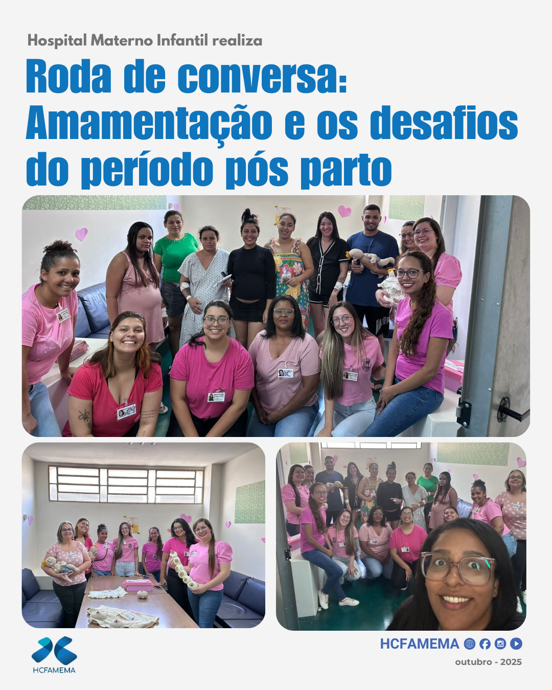 O Hospital Materno Infantil do HCFAMEMA realizou, no dia 23 de outubro, a Roda de conversa sobre Amamentação e os desafios do período pós-parto, em colaboração com os estudantes do 1º Curso de Qualificação Profissional de Doula, ministrado pela docente…