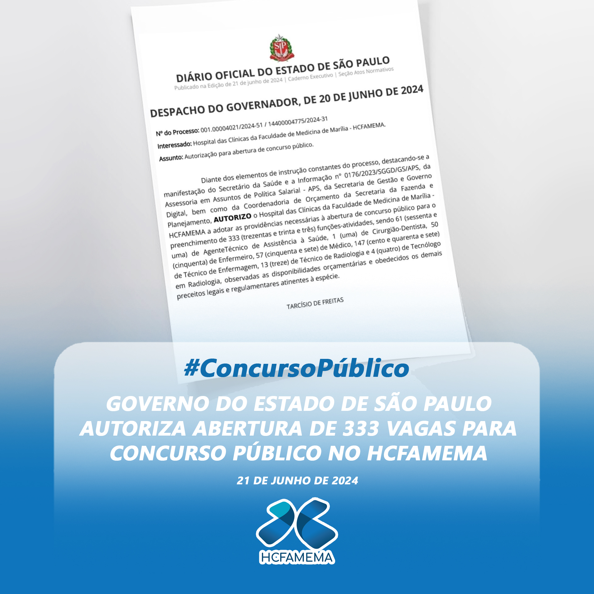 CONCURSO PÚBLICO DO HCFAMEMA! O Governador do estado de São Paulo, Tarcísio de Freitas, autorizou, no dia 20 de junho de 2024, a abertura de concurso público para o Hospital das Clínicas da Faculdade de Medicina de Marília. No total,…