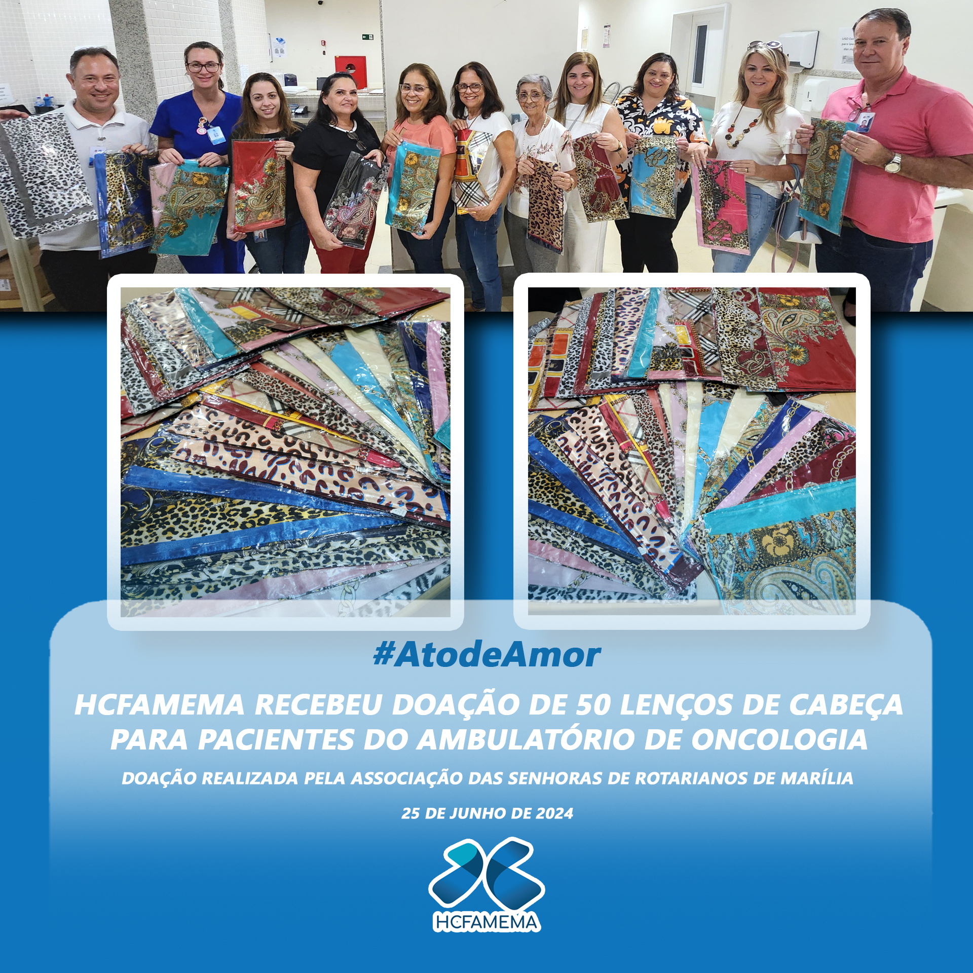 O HCFAMEMA recebeu doação de 50 lenços de cabeça para pacientes do ambulatório de Oncologia. A boa ação foi feita pela Associação das Senhoras de Rotarianos de Marília, presidida pela senhora Telma Custódio. Na ocasião, colaboradores do hospital recepcionaram as…