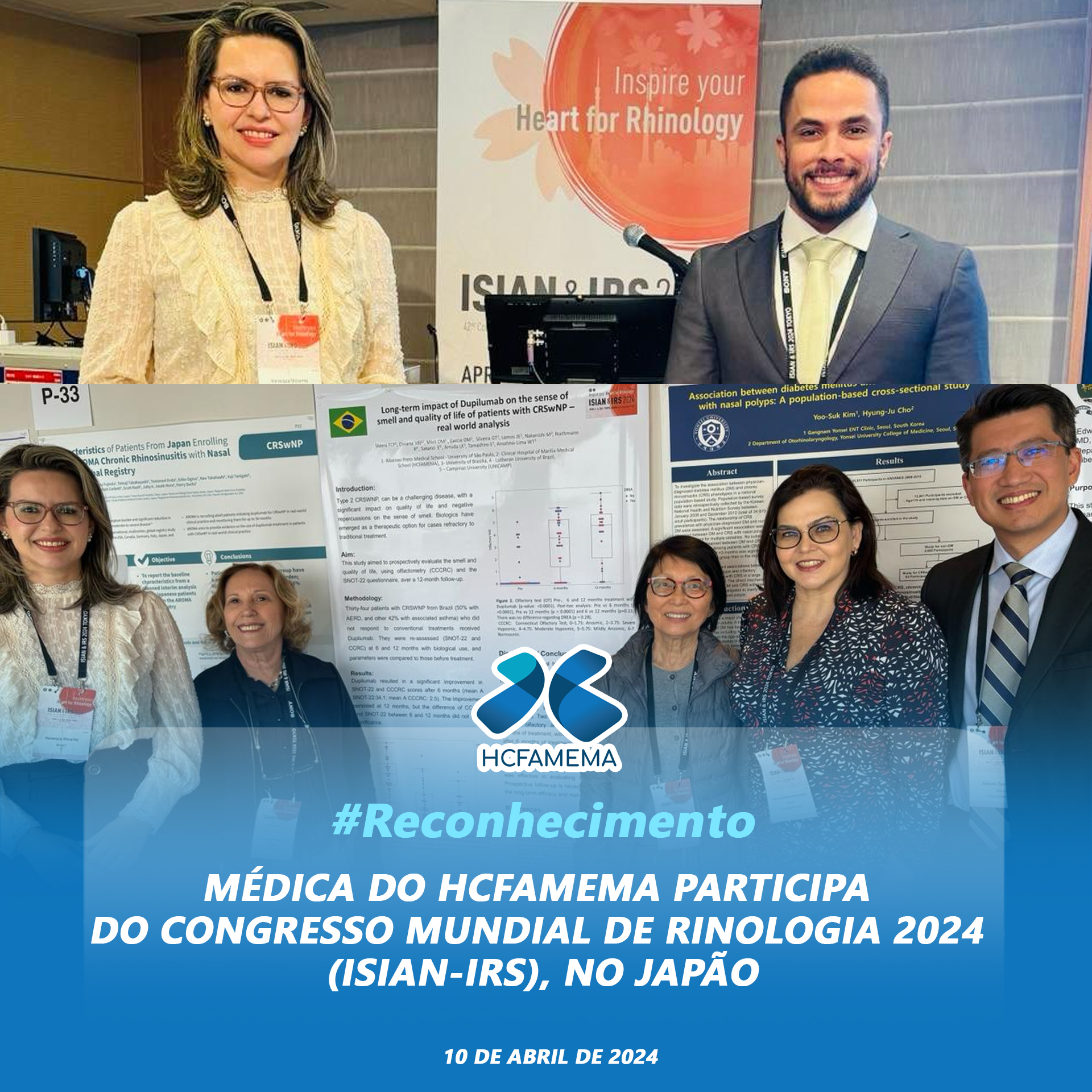A médica Vanessa Dinarte, otorrinolaringologista do HCFAMEMA, participou do Congresso Mundial de Rinologia 2024 (ISIAN-IRS), ocorrido no Japão. Junto com o ex-residente do serviço, Dr Wilker Lira, ela apresentou o trabalho “Prevalência da diminuição da função olfatória em adultos em…