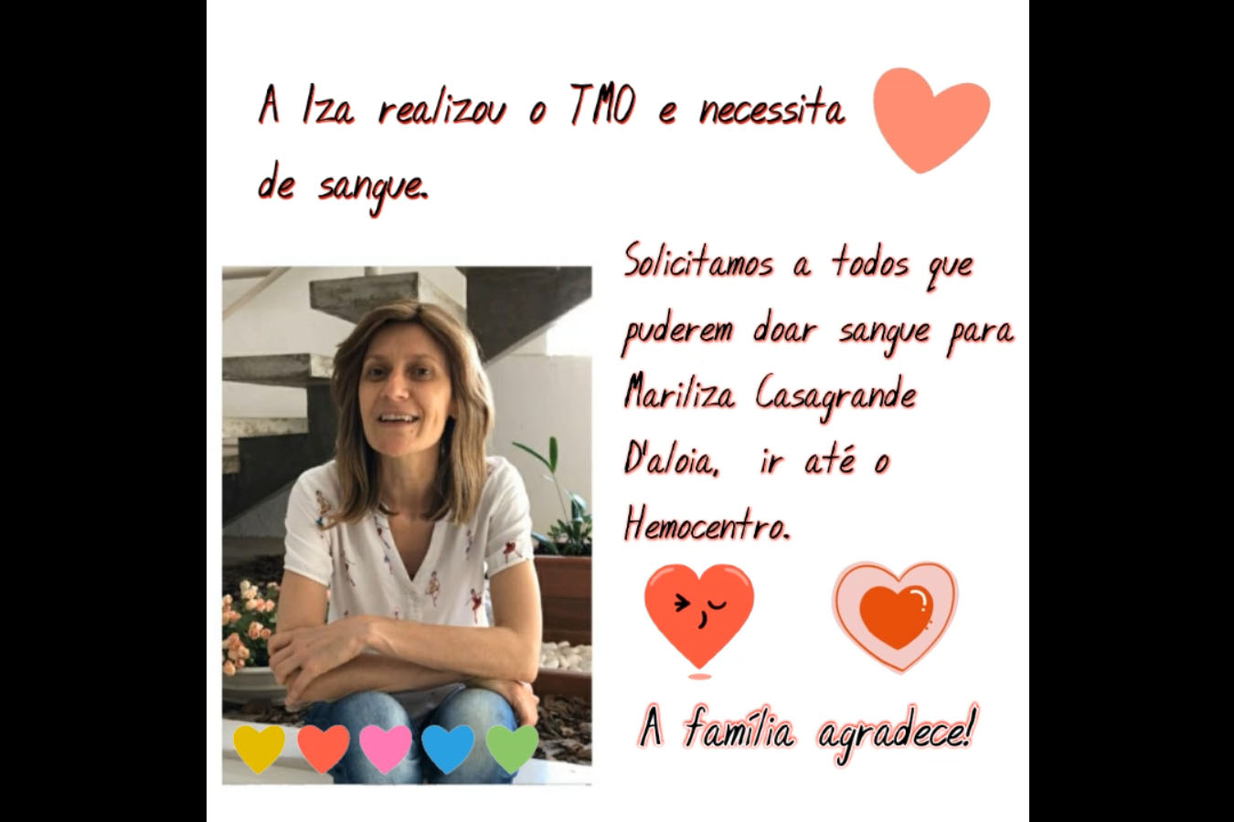 A professora de Emei, Mariliza Casagrande D´Aloia, realizou recentemente um Transplante de Medula Óssea (TMO) e necessita de transfusões de plaquetas de sangue para seu tratamento. Para não deixar afetar o estoque do Hemocentro a família dela está realizando nas…