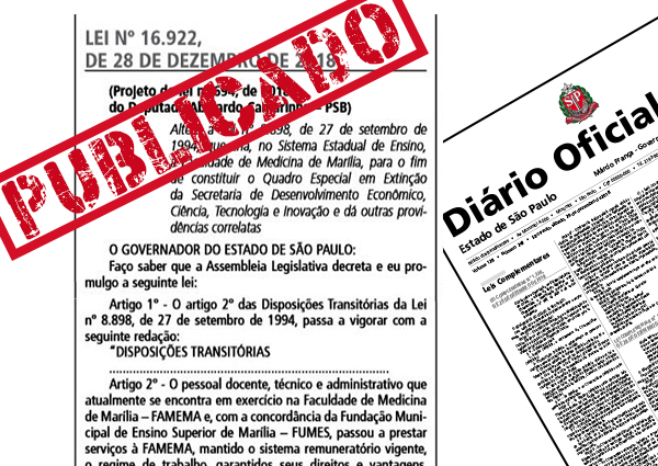 O Governador do Estado de São Paulo, Márcio França, promulgou nesta sexta-feira, dia 28 de dezembro, o Projeto de lei nº 694/2018, de autoria do deputado Abelardo Camarinha, que cria no Sistema Estadual de Ensino para constituir o quadro especial…