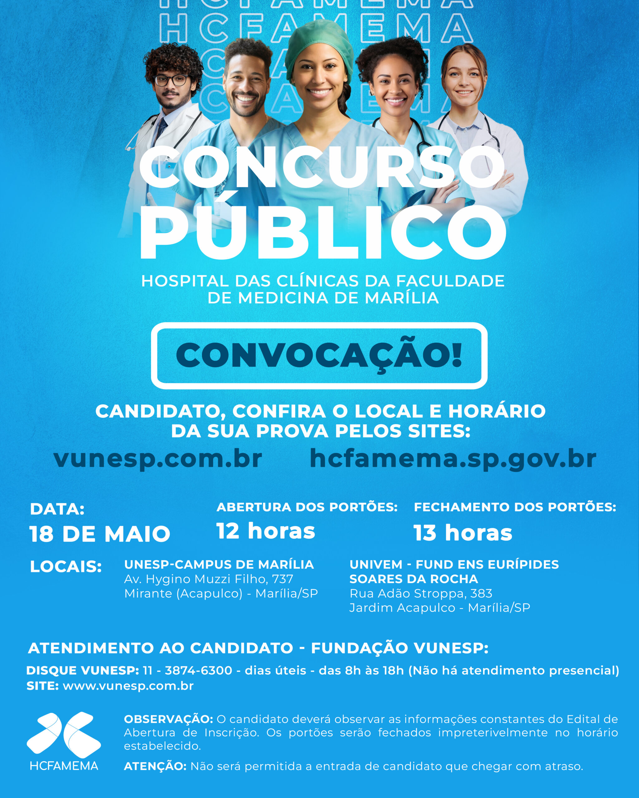 Os locais de prova foram divulgados. Para consultar o seu, acesse o site da VUNESP, na área do candidato! Lembrando que a prova OBJETIVA, de caráter eliminatório e classificatório, terá duração de 3h30min, no dia 18/05/2025, abertura dos portões às…