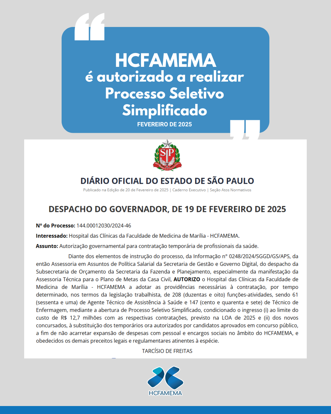 O Governador do estado de São Paulo, Tarcísio de Freitas, autorizou, no dia 20 de fevereiro de 2025, a contratação, por tempo determinado, nos termos da legislação trabalhista, de 208 funções-atividades, sendo 61 de Agente Técnico de Assistência à Saúde…