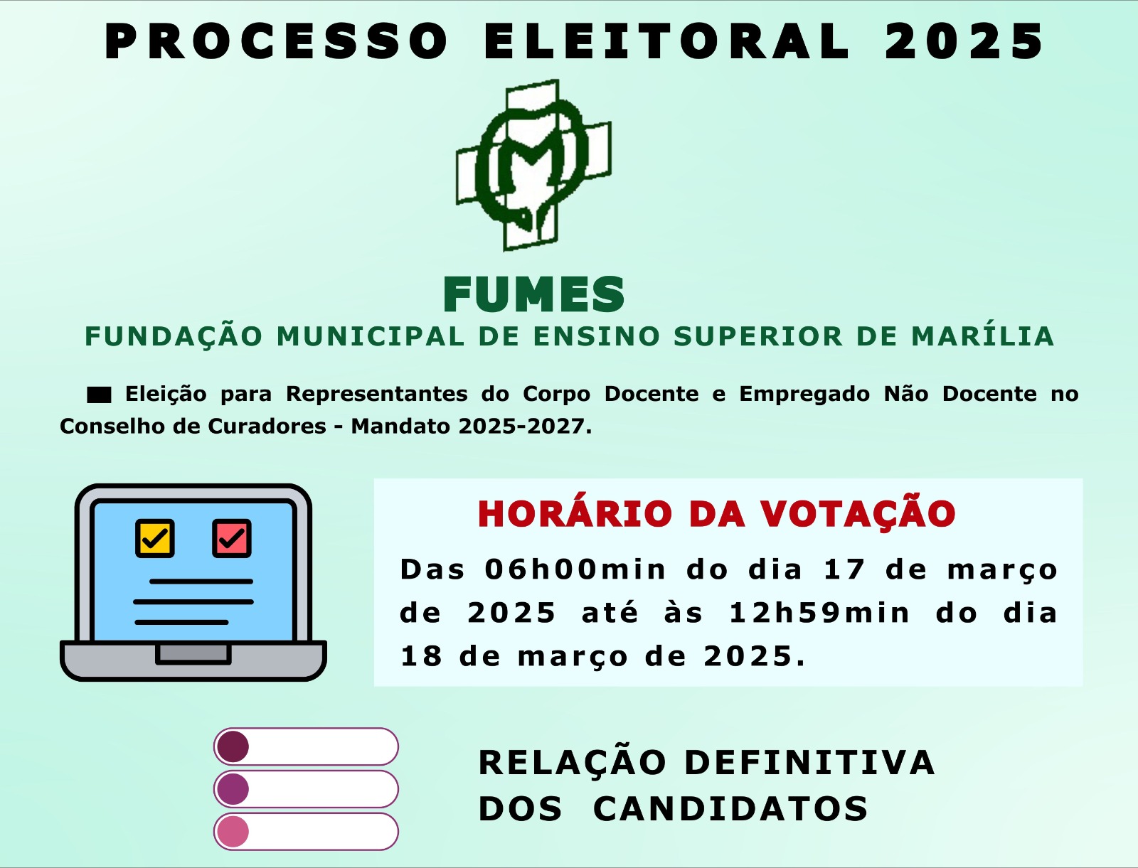 RECOMENDAÇÕES LABORATÓRIO DE INFORMÁTICA A Comissão Eleitoral e o Grupo Técnico, responsáveis pela Eleição para representantes do corpo docente e empregado não docente no Conselho de Curadores da Fundação Municipal de Ensino Superior de Marília (FUMES), mandato 2025-2027, confirmam recomendações…
