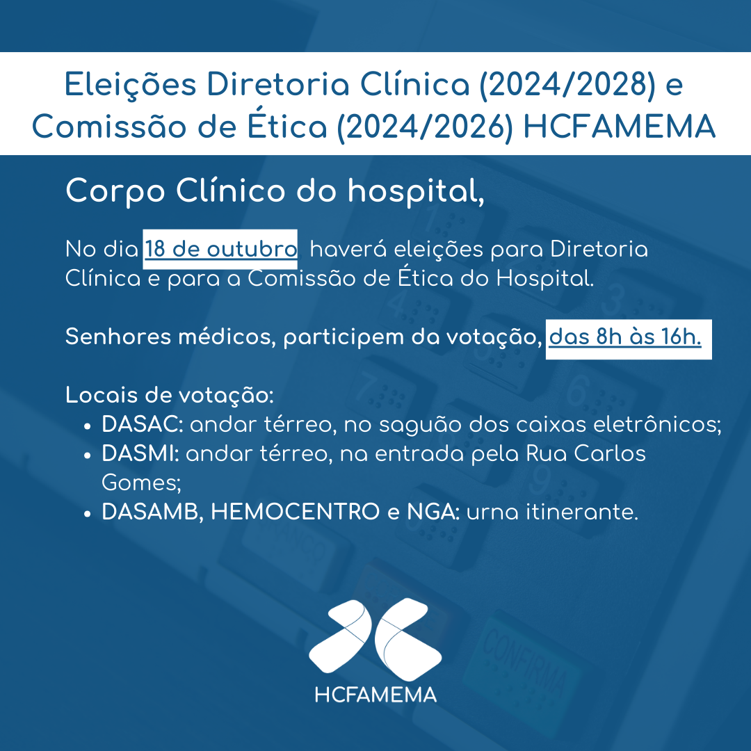 No dia 18 de outubro, haverá eleições para Diretoria Clínica (mandato 2024/2028) e para a Comissão de Ética (mandato 2024/2026) do Hospital. Senhores médicos, participem da votação, das 8h às 16h. Locais de votação: – DASAC: andar térreo, no saguão…