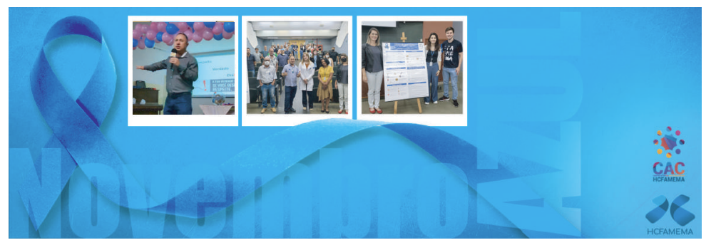 A Campanha Novembro Azul, que chama atenção para a Saúde do Homem, foi lembrada no HCFAMEMA com atividades voltadas aos colaboradores e também à comunidade. O Centro de Apoio ao Colaborador (CAC) fez chamamento de colaboradores do sexo masculino com mais de 40 anos para realização do PSA, exame realizado como Check Up para diagnosticar o câncer de próstata. NOVEMBRO AZUL A Gerência de Educação em Saúde realizou em novembro 10 intervenções com palestras para grupos de colaboradores, associações e clubes de serviço da região. Ao todo a mensagem de conscientização “Saúde do Homem” foi transmitida para mais de 300 pessoas. Entre as instituições visitadas estão o Centro de Ressocialização de Marília, Rotarys Clubes de Marília e Vera Cruz, além de igrejas e PodCast.
