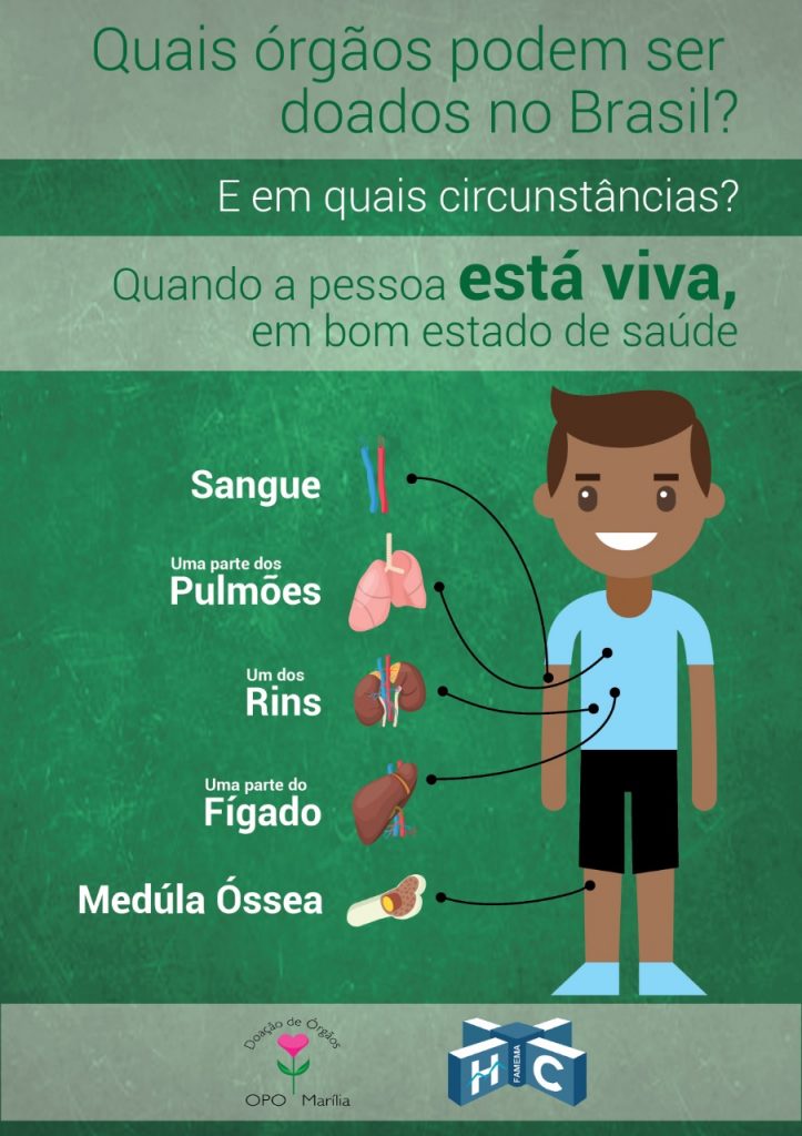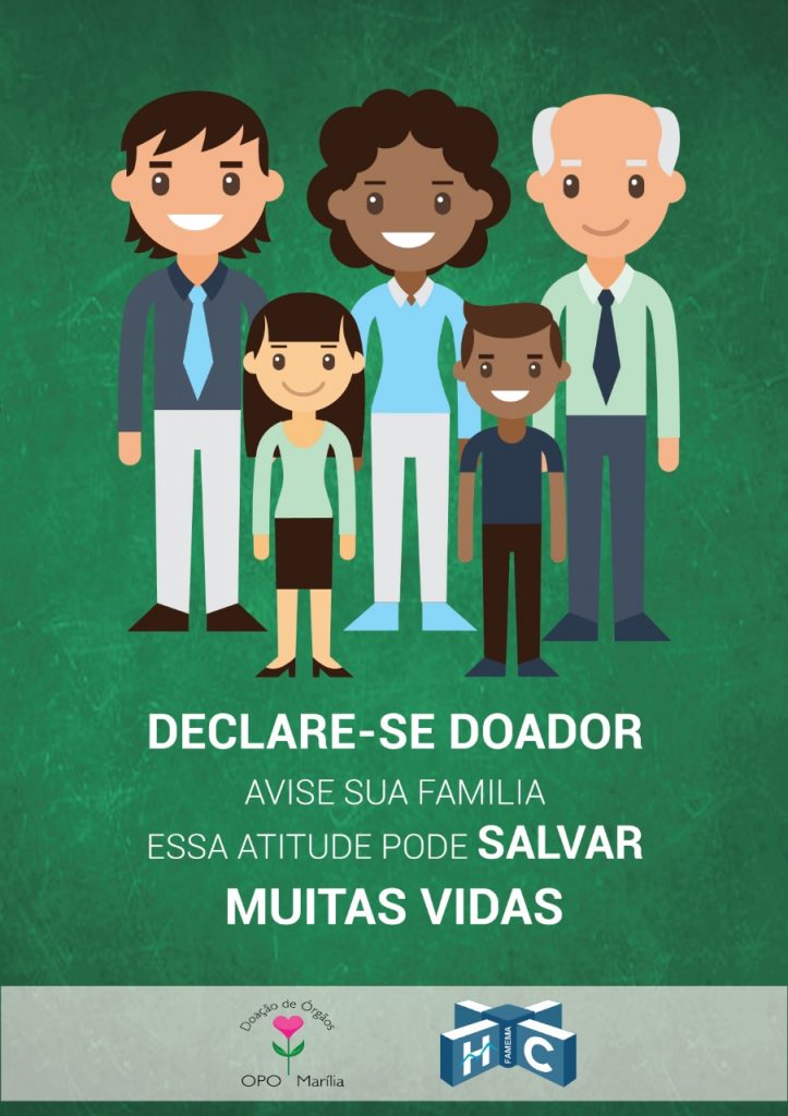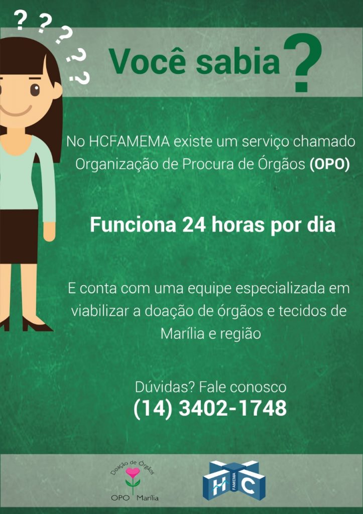 O Núcleo de Organização de Procura de Órgãos (OPO) do Hospital das Clínicas da Faculdade de Medicina de Marília – HCFAMEMA realiza de 21 a 30 de setembro uma exposição interna de cartazes informativos sobre a doação de órgãos no saguão do andar S da unidade HC I, próximo ao relógio de ponto dos funcionários.
