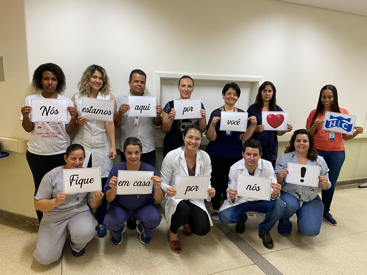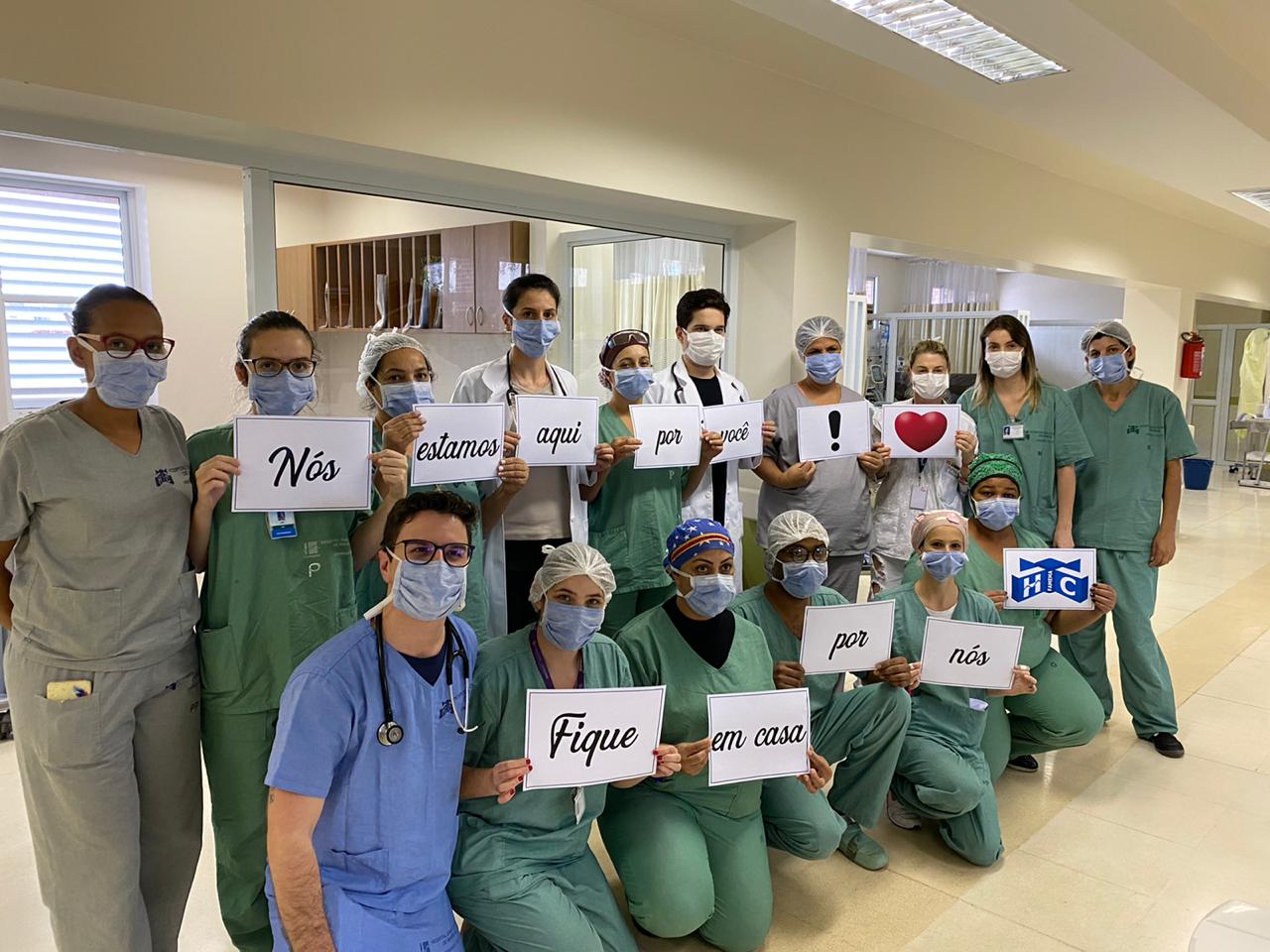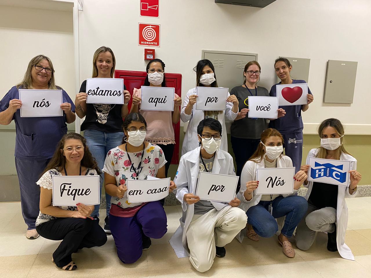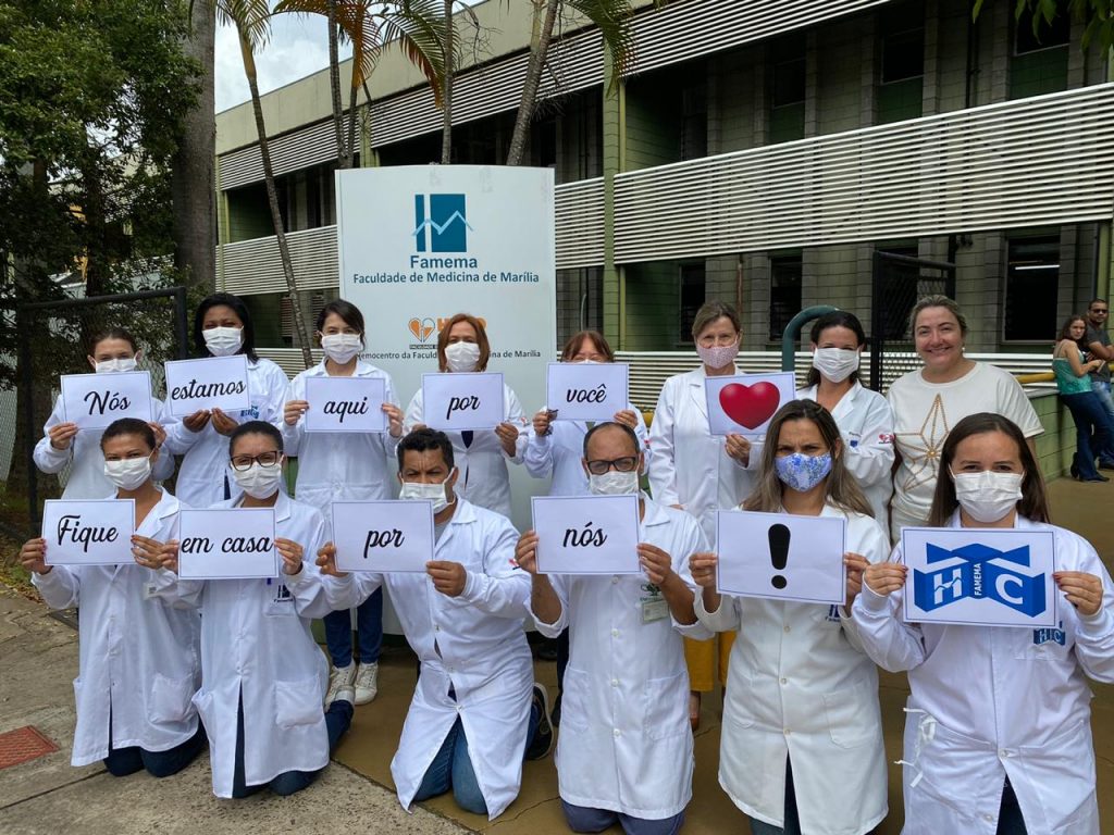 Médicos, enfermeiros e profissionais do setor administrativo do Hospital das Clínicas da Faculdade de Medicina de Marília – HCFAMEMA fizeram fotos para pedir à população que fique em casa como forma de proteção ao novo coronavírus (COVID-19). “Nós estamos aqui por você. Por favor fique em casa por nós”. É a mensagem repassada pelos profissionais. As fotos com profissionais de diversos setores e departamentos do hospital foram publicadas nas redes sociais da instituição nesta quinta-feira (19).