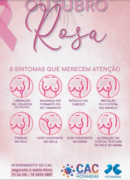 As colaboradoras do HCFAMEMA terão a oportunidade de realizar entre os dias 3 e 14 de outubro, das 10h às 11h30, procedimento de triagem para o exame de mamografia. O atendimento acontecerá no Centro de Apoio ao Colaborador (CAC) com foco especial nas funcionárias de 40 a 69 anos (sem antecedentes de câncer de mama na família) ou mulheres com mais de 35 anos pertencentes a grupos de risco aumentado. Conforme informações da diretora técnica do CAC, Viviane Gallina, não é necessário agendamento prévio porque os atendimentos ocorrerão por ordem de chegada. “A ação faz parte das atividades do Outubro Rosa, que chama a atenção para o câncer de mama. A triagem será realizada pela equipe de médicos e enfermeiros. Após o atendimento, serão agendadas para fazerem o exame no próprio HCFAMEMA”. Vale destacar que o atendimento é exclusivo para colaboradoras do HCFAMEMA. Após o atendimento de triagem as colaboradoras terão o exame agendado entre os dias 17 e 28 de outubro. Mais informações sobre a ação conjunta do CAC e DASADT, podem ser obtidas diretamente no CAC ou através do ramal 3887.