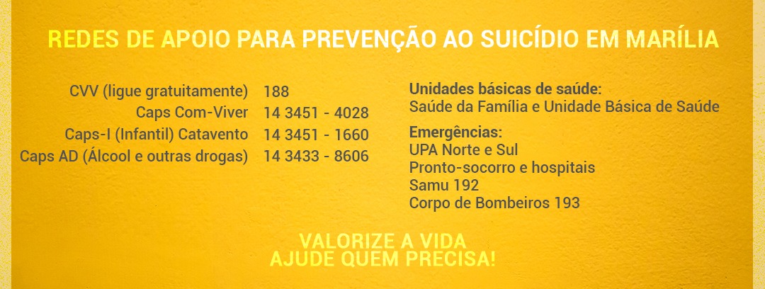 Para tentar diminuir os casos de suicídio, especialmente em nossa cidade e região, o Hospital das Clínicas da Faculdade de Medicina de Marília – HCFAMEMA quer sensibilizar e conscientizar a população sobre o valor da vida. O suicídio precisa ser visto com mais respeito e empatia pela sociedade.