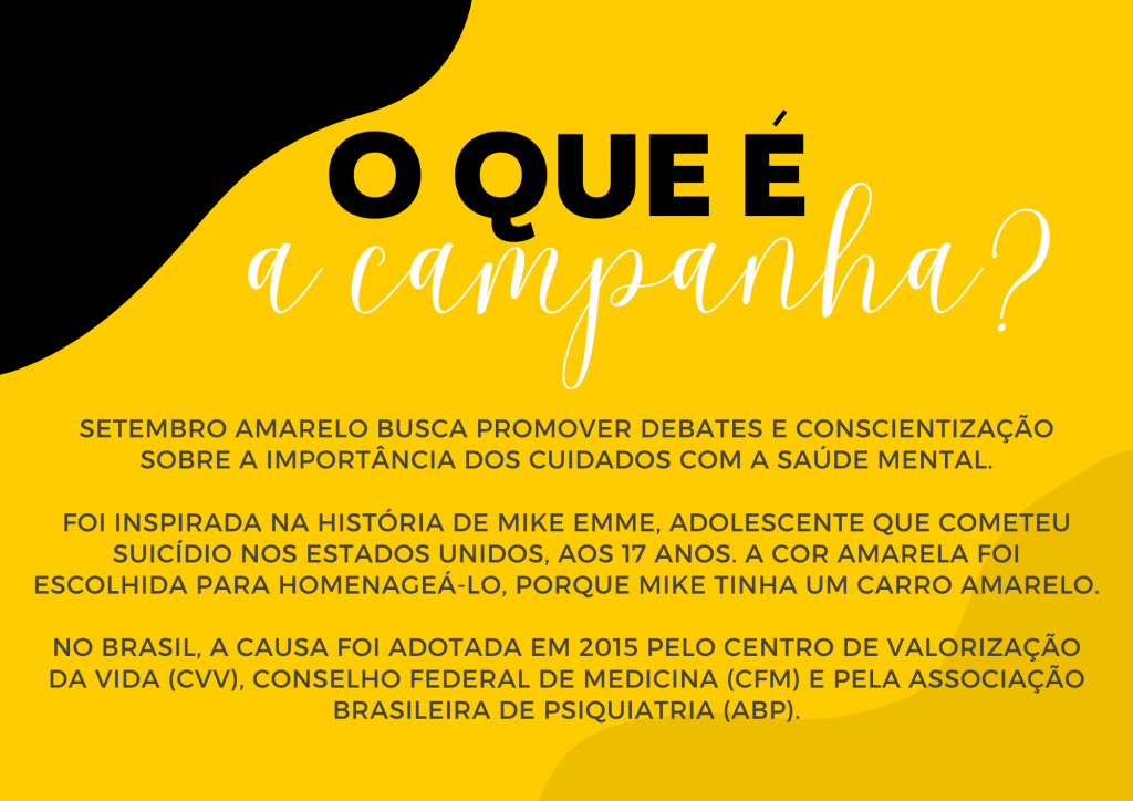 Sabemos que cuidar da mente é fundamental para uma vida plena e saudável. Convidamos você a vestir o amarelo da esperança e se juntar a nós nessa jornada de empatia, apoio e compreensão mútua.