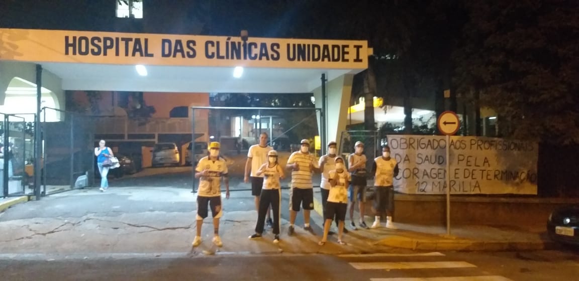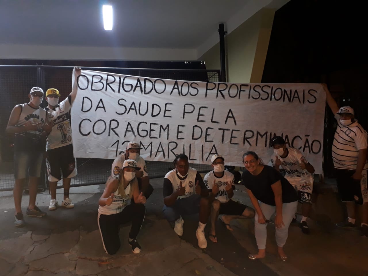 A Fiel Torcida Jovem Camisa 12 do Sport Club Corinthians Paulista realizou na noite desta quarta-feira, dia 1º de abril, ações em oito cidades brasileiras para homenagear os profissionais da saúde que estão na linha de frente do combate à Pandemia da COVID-19, atendendo os pacientes suspeitos ou confirmados da doença. Em Marília, o local da homenagem a todos foi o Hospital das Clínicas da Faculdade de Medicina de Marília – HCFAMEMA, única referência do SUS para o atendimento aos casos mais graves (alta complexidade) para toda a região, formada por 62 municípios e 1,2 milhão de habitantes.