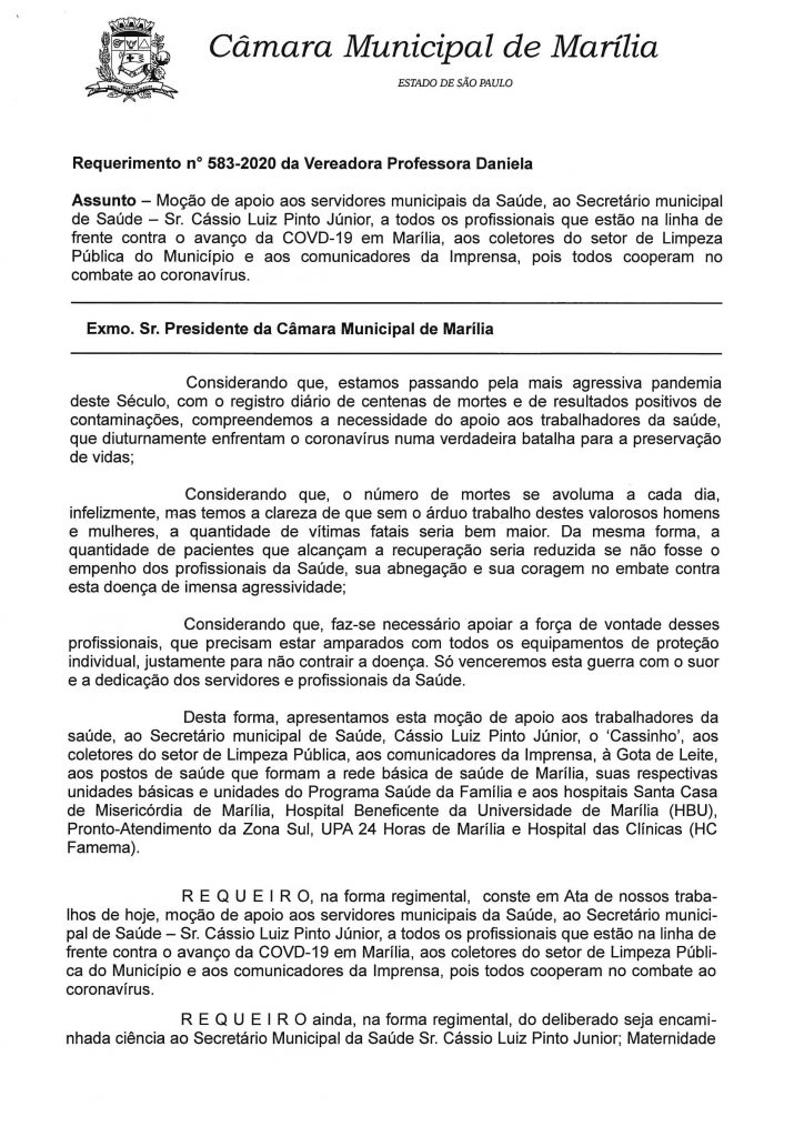 A Vereadora Professora Daniela (PR) é a autora de uma Moção de Apoio em favor de todos os profissionais de saúde, de limpeza e de comunicação, como também de todas as instituições públicas e privadas, que estão na linha de frente contra o avanço da COVID-19 em Marília. O requerimento parlamentar foi aprovado na sessão da Câmara do dia 24 de junho. A proposição foi enviada a todos os homenageados e foi recebida e protocolada no dia 24 de julho pelo Hospital das Clínicas da Faculdade de Medicina de Marília – HCFAMEMA.