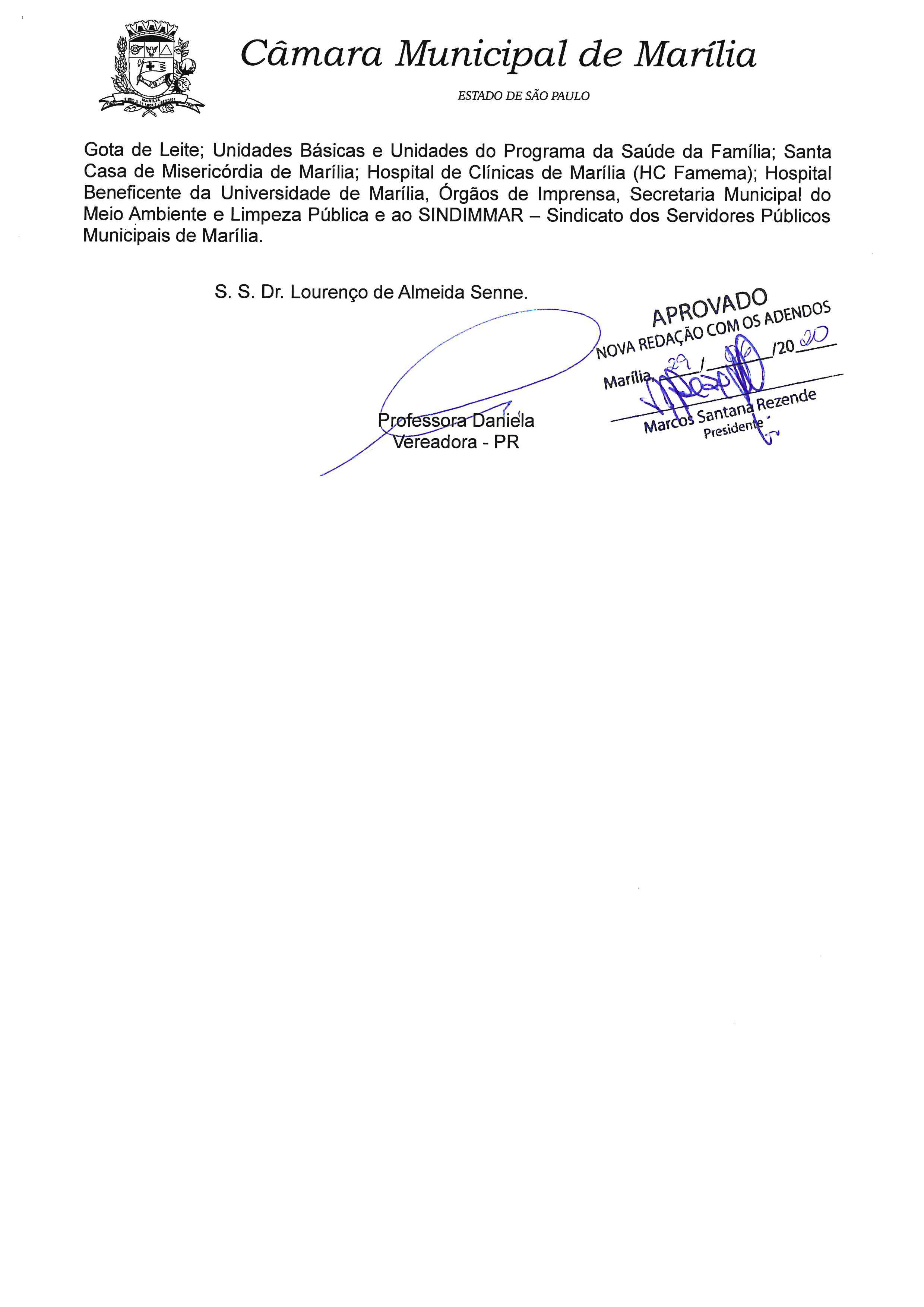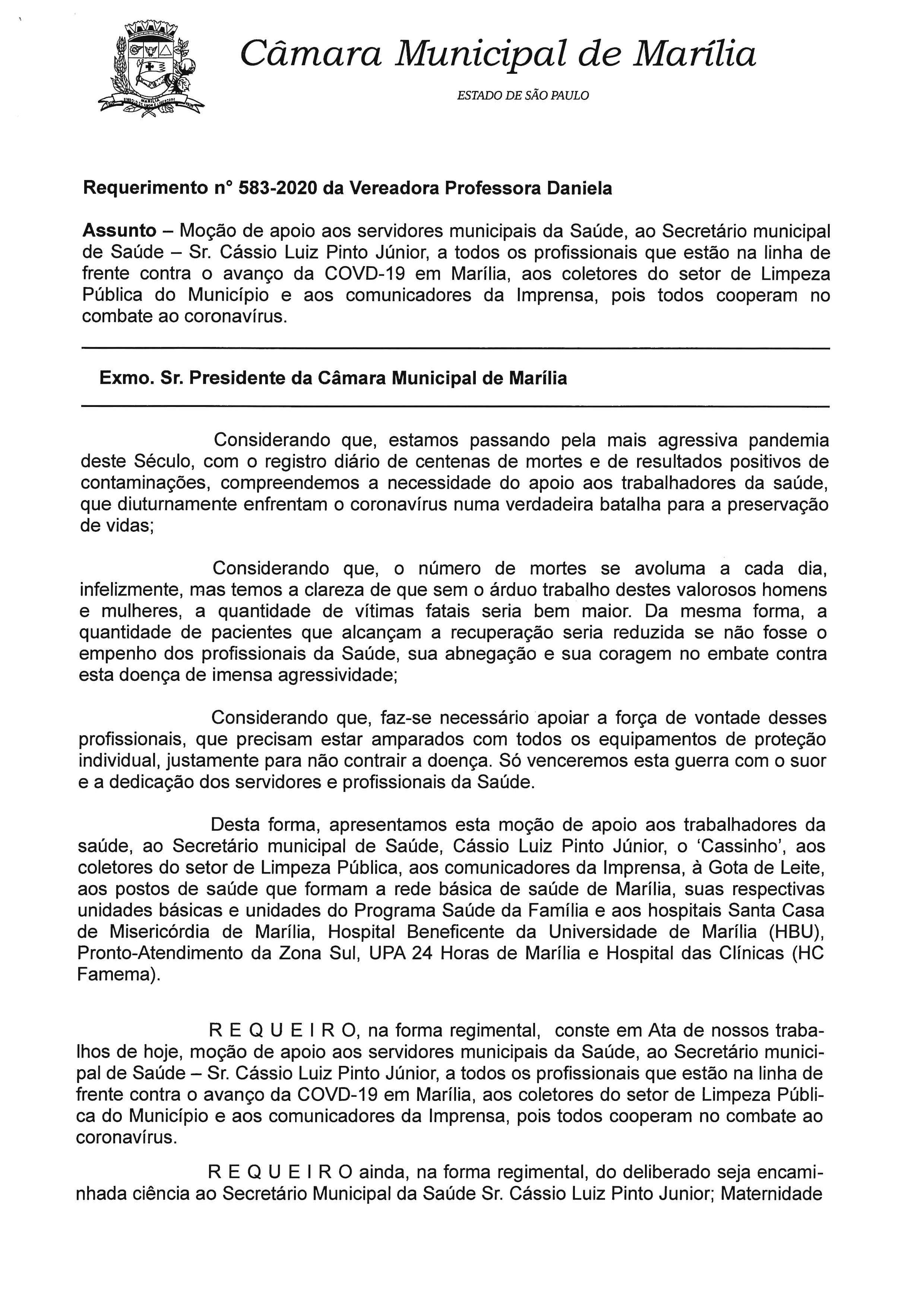 A Vereadora Professora Daniela (PR) é a autora de uma Moção de Apoio em favor de todos os profissionais de saúde, de limpeza e de comunicação, como também de todas as instituições públicas e privadas, que estão na linha de frente contra o avanço da COVID-19 em Marília. O requerimento parlamentar foi aprovado na sessão da Câmara do dia 24 de junho. A proposição foi enviada a todos os homenageados e foi recebida e protocolada no dia 24 de julho pelo Hospital das Clínicas da Faculdade de Medicina de Marília – HCFAMEMA.
